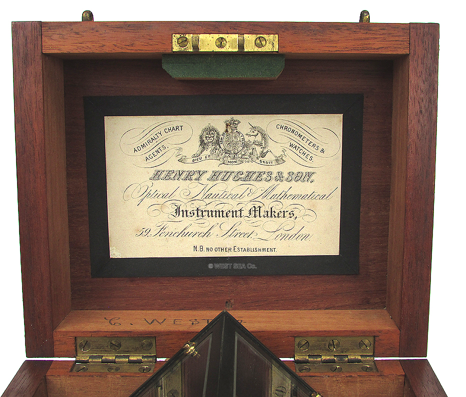 3.30 MINIATURE SEXTANT. Truly extraordinary, if not completely unique, 2nd quarter 1800’s midshipman’s sextant (aka lifeboat sextant) made by the highly revered early English maker William Cary as beautifully hand-engraved on the large silver arc “Cary, London 968.” This amazing instrument is actually a semi circumferentor having a scale divided to a full 180 degrees of arc, sub-divided to 20 arc minutes! This was a spectacular feat of precision engineering at the time, attesting to Cary’s genius. It was not attempted by any of his contemporaries even on larger more easily calibrated instruments. This pristine all brass instrument is in its original blackened finish. The tangent fine adjust knob works in consort with the knurled index arm stop. The large scale is overridden by the index arm vernier scale calibrated to provide a reading down to an accuracy of an amazing 20 arc seconds! This was virtually unheard of for an instrument of its size at the time. It is a cutting age accomplishment literally akin to the moon exploration more than 125 years later! The index arm is equipped with an adjustable magnifier to view the reading. This compact navigational instrument has both index and horizon mirrors and a height adjustable sight holder which accommodates 3 telescopes housed in its box. Incredibly, 2 index filters and 2 horizon filers are also provided. On the reverse it has a sculpted solid ebony handle and 3 positioning “feet.” This diminutive instrument measures a mere 5 ¼ inches wide on the broad arc and 4 ½ inches long on the index arm. It is housed in its original rich African mahogany box with very fine hand-dove tailed construction measuring 5 ½ inches square by 3 ¼ inches thick. It is complete with all three sighting tubes and 2 eye piece filters. Incredibly the box lock is complete with its original skeleton key! Within the lid are two original labels. The first is by “HENRY PORTER Successor to the Late W. CARY.” The second is a hand-inked label dated 1888 indicating the correction of the index error in June 1888. This extraordinary presentation is worthy of the finest world class museum. In fact it must ultimately go to a museum as the trail of its past dictates. We are all caretakers of our prized possessions, but not owners in perpetuity. 3900 |
