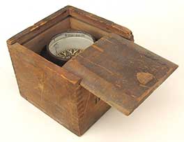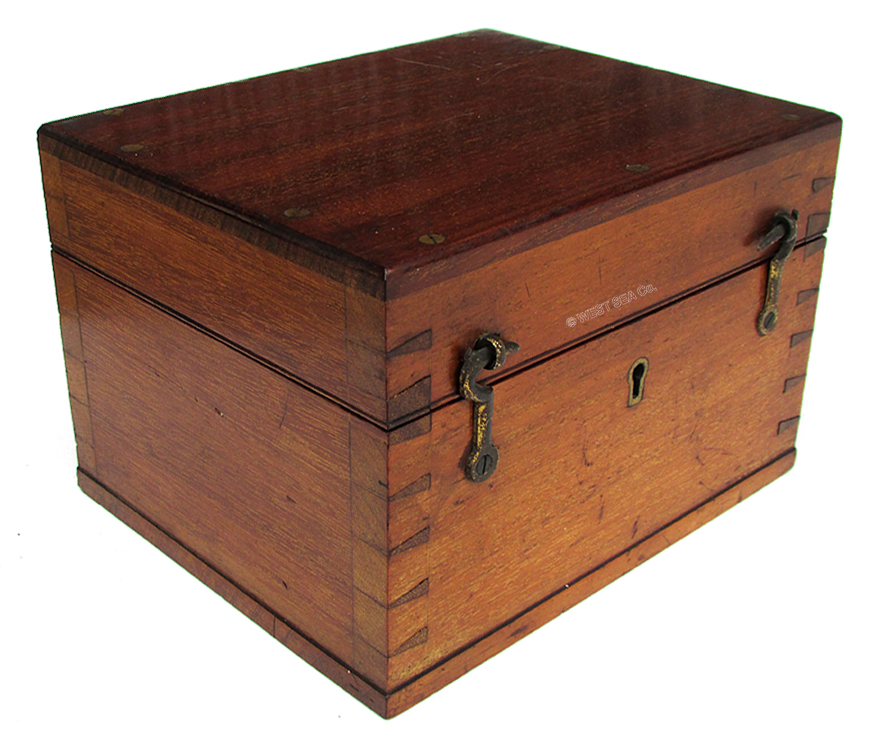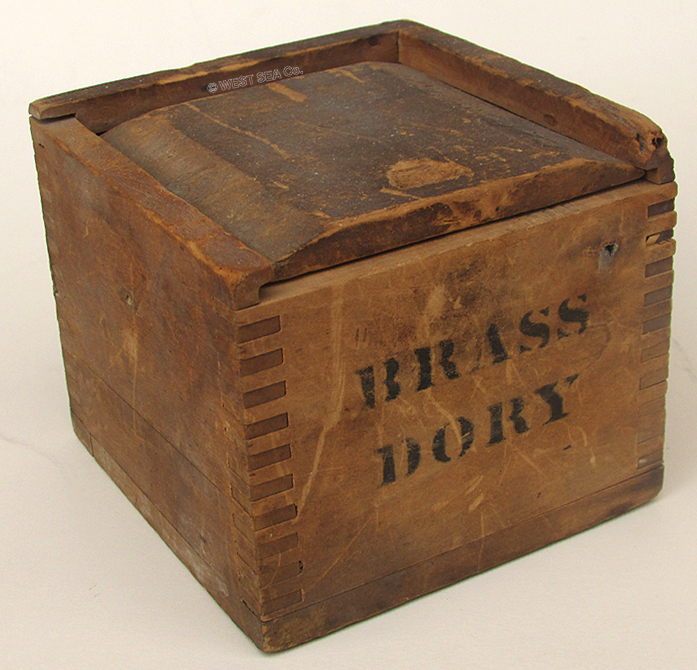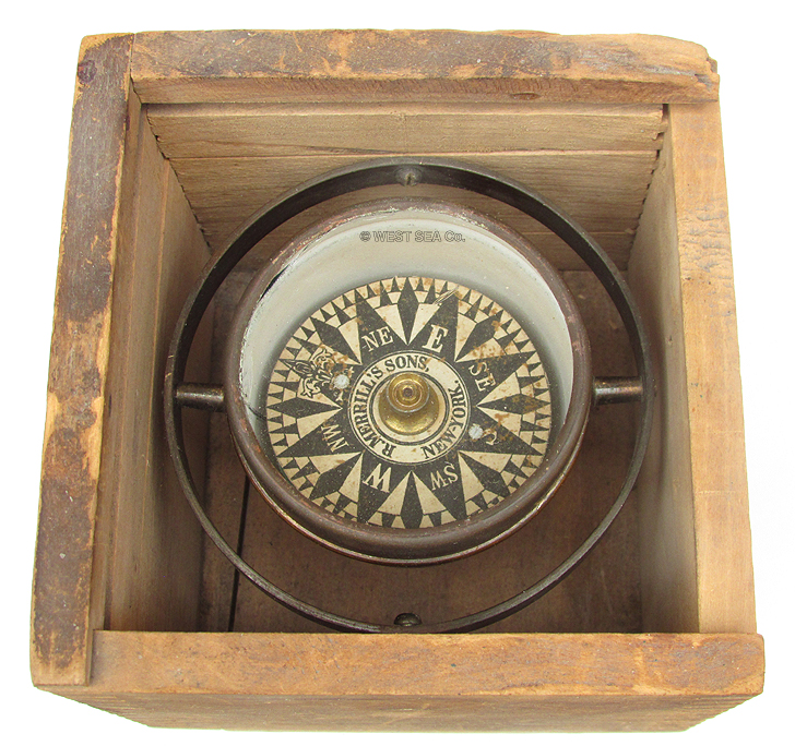 3.59 EARLY BOXED COMPASS. Really exceptional, miniature 19th century American small craft compass made by the noted nautical instrument makers “R. MERRILL’S SONS, NEW YORK” as boldly signed around the center pivot. This delightful presentation is virtually unique, in that we have never seen such a diminutive example in our 45+ years in the nautical antiques business. The little antique compass has a beautifully stenciled dry card, reminiscent of its much larger cousins. The classic compass rose is marked in points, with the Cardinal and Intercardinal points identified. North is designated by an ornate fleur-de-lis. Remarkably, the card is clearly divided down to ½ points of the compass. Yet it is a mere 1 7/8 inches in diameter! The compass card rides on a very high grade brass pivot with quality agate bearing. This is a most unusual feature for a compass of this size. The card is housed in its original weighted bowl suspended in brass gimbals in it s original dove-tailed pine box with sliding lid. The box measures 4 1/8 inches square and 3 ½ inches tall. The compass body itself is 2 1/8 inches in diameter. Without a doubt this is the smallest genuine sea-going compass of its type extant. Totally original and in excellent working condition. A real keeper! 649 |