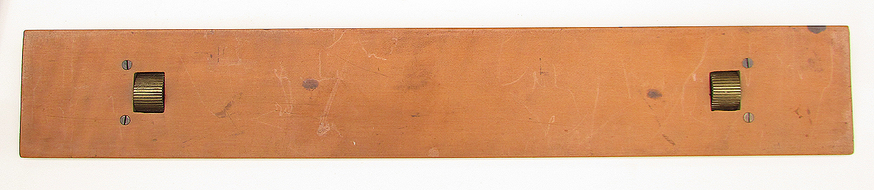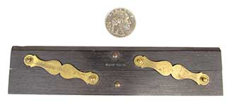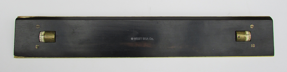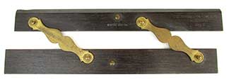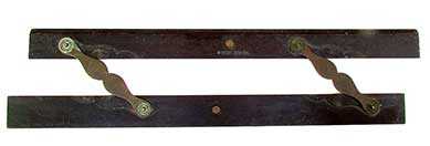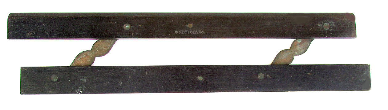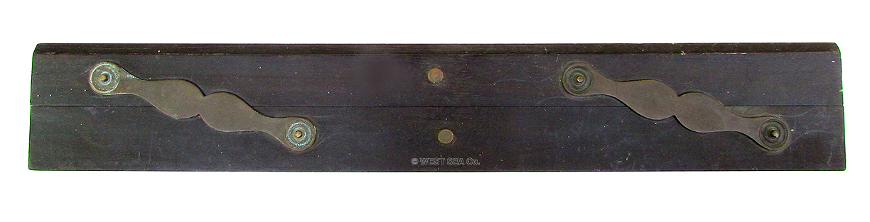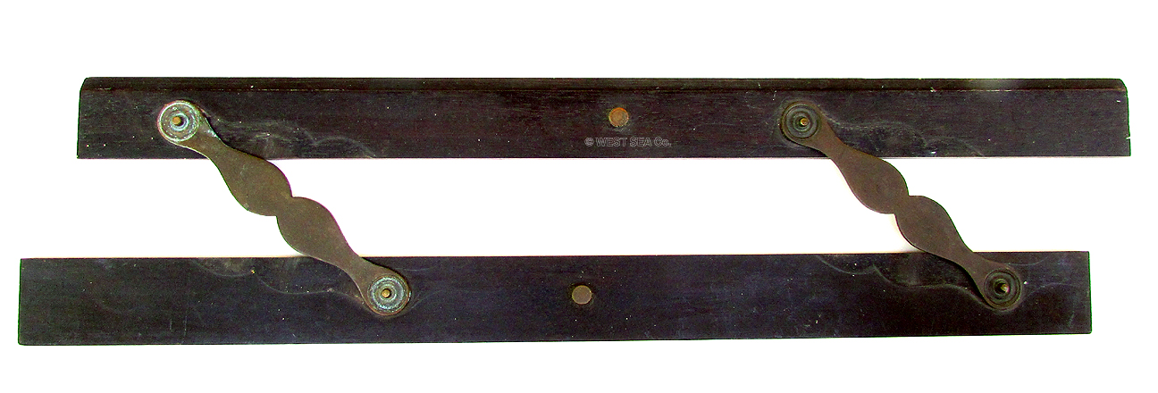 3.37 NAVIGATOR’s RULES. Very early 1800’s parallel rules of the type used by the ship’s navigator to determine courses and positions of his ship on the vessel’s charts. This fine old example is made with limbs of solid ebony affixed with 2 pivoting brass arms. For aid in positioning brass “buttons” are provided on the center of each arm. Each arm is squared on the leading edge and beautifully chamfered on the trailing edge. The brass has acquired a lovely bronze age patina and the ebony wood is solid and straight, without flaw. 15 inches long by 2 3/8ths inches wide. Excellent, fully functional condition showing years of actual use at sea. 95 (See item 3.34). |
