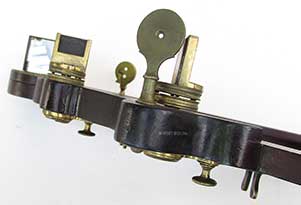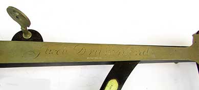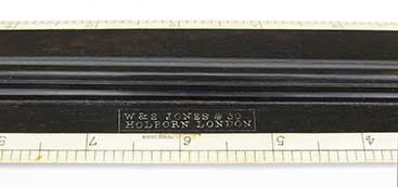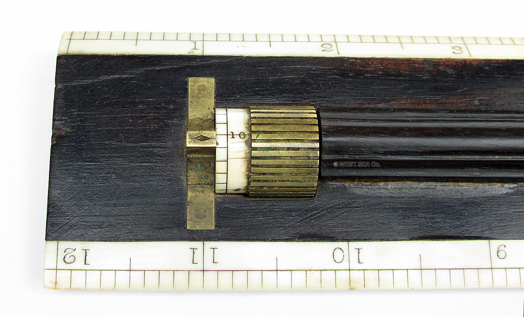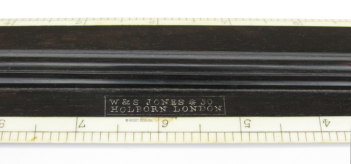 3.34 18th C. NAVIGATOR’s RULES. Especially nice parallel rolling rules made by the preeminent English makers “W. & S. JONES * 30 HOLBORN LONDON” as marked in the center. This early navigational instrument is made of ebony and ivory with brass fittings. It consists of an internally weighted rolling axle with corrugated brass drums on each end. The drums grasp the surface of the chart allowing the instrument to travel in a parallel direction. Of special note are the ivory ends of the roller which trace from 0 to 2 inches in increments of 1/10th inch when rolled. This complication is in addition to the fact that the leading edges are ivory scales marked in tenths of inches from 0 to 12! Absolutely pristine original condition in all respects. It is hard to believe this original instrument is more than 220 years old! 349 William and Samuel Jones began their scientific instrument manufactory on Holborn Hill, London in1791. (Gloria Clifton, “Directory of British Scientific Instrument Makers 1550-1851, 1995, National Maritime Museum and Philip Wilson Publishers, Ltd.) |
