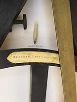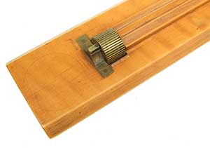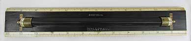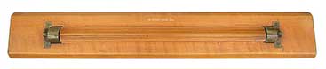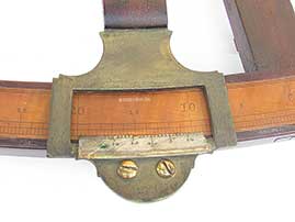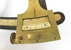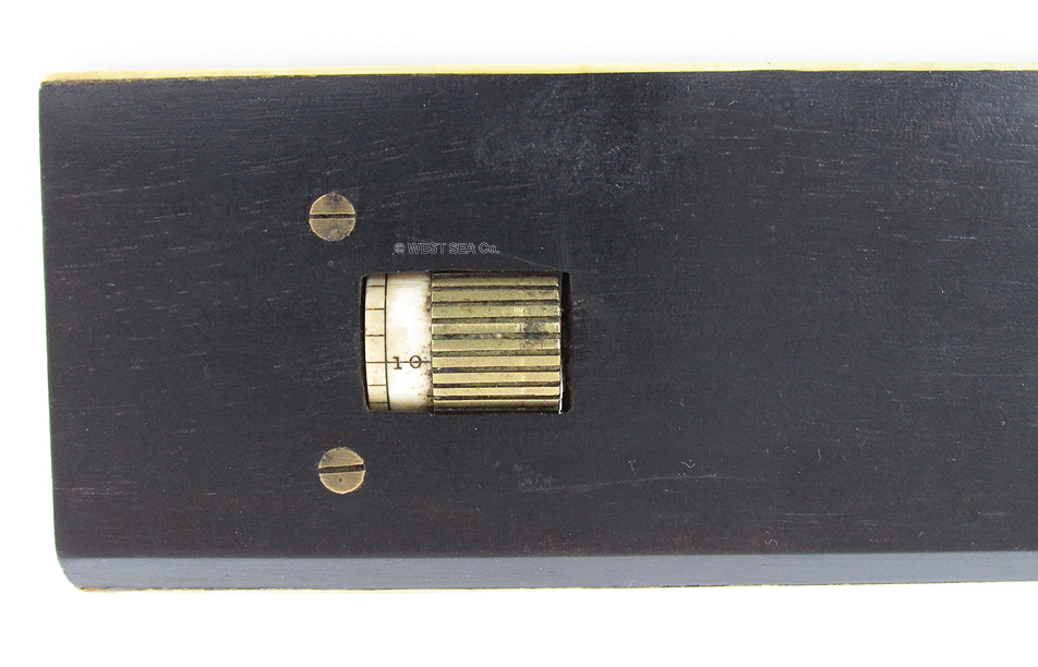 3.46 EARLY PARALLEL RULES. An especially sweet example of a ship’s navigator’s chart rules form the early 1800’s. This delightfully petite instrument is made of rare (now virtually extinct) British boxwood with brass fittings. Known as a “rolling rule” the ingenious design incorporated 2 serrated rollers on a central column to traverse the chart table without changing the rule’s longitudinal orientation. As such the proposed ship’s course could be set over a variety of options on the chart table. This high quality instrument is likely of English manufacture. It measures 12 inches long 1 7/8 inches wide. It is in literally magnificent original condition with a rare. Very sought after “tiger stripe” grain pattern. Truly one of the nicest of its genre we have encountered in our 40+ years. A keeper! 195 |