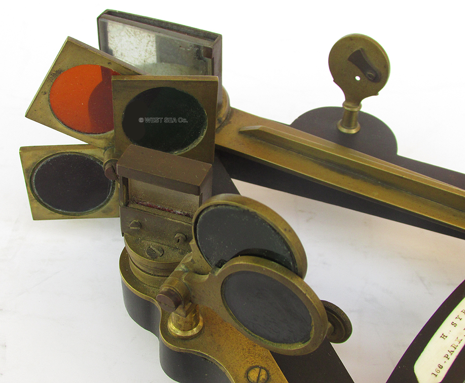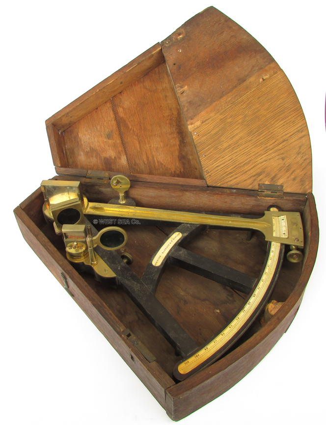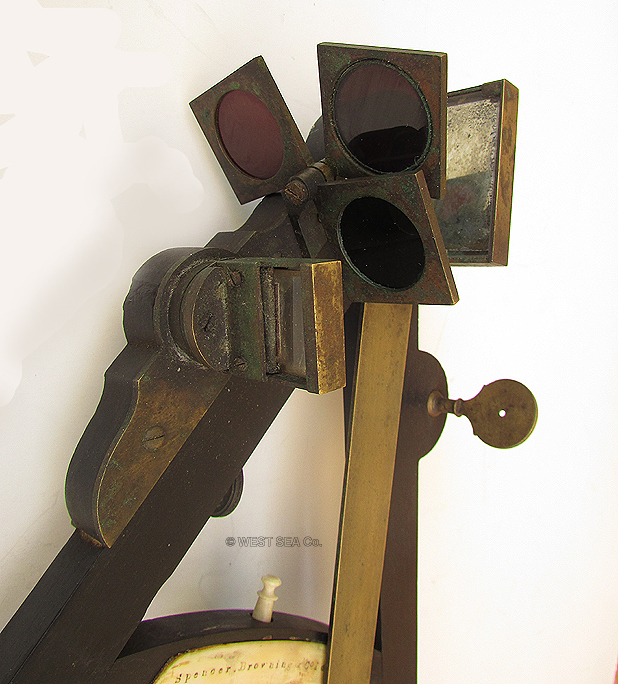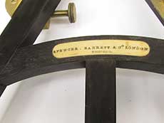 3.39 CASED OCTANT. Very clean and complete mid-1800’s octant with the ivory maker’s plate signed “SPENCER, BARRETT & Co. LONDON.” This fine navigational instrument has limbs of ebony with brass furniture and ivory scales. The large ivory arc is calibrated in degrees from -3 to 108 sub-divided by 20 arc minutes, marked by 5’s. The ivory vernier is calibrated from right to left 0 - 20 indicating an accuracy of a single arc minute. The braced brass index arm is 13 inches long, operated by a knurled brass locking screw on the reverse and a knurled tangential fine adjustment screw. It has the typical mirror box adjustment apparatus on the reverse and 3 brass “feet” for mounting in the box. The frame is complete with its index and horizon mirrors, its full set of index filters and it singular round horizon filter. The horizon mirror contains a rarely found adjustment feature. The non-telescopic peep sight is reminiscent of quadrants from the 1770’s with its pivoting shade over the 2 sights. All brass components are in a remarkable state of bright brass, original preservation. The box too exhibits 18th century form being of the “stepped keystone” variety made of oak. It is complete with its original skeleton lock and striker plate. This fine instrument measures 13 inches tall by 10 ½ inches wide. The original box is 14 inches long by 12 ½ inches wide and 4 inches thick on the upper tier. Considering it age, this instrument is in outstanding original condition in all respects. Far above average. Absolutely no noticeable flaws. Priced to sell!!! 695 Spencer & Co., London began business in 1817. They were known to have sold octants. In the early 2000’s this instrument would have easily sold for $1995. Figure that with inflation! |