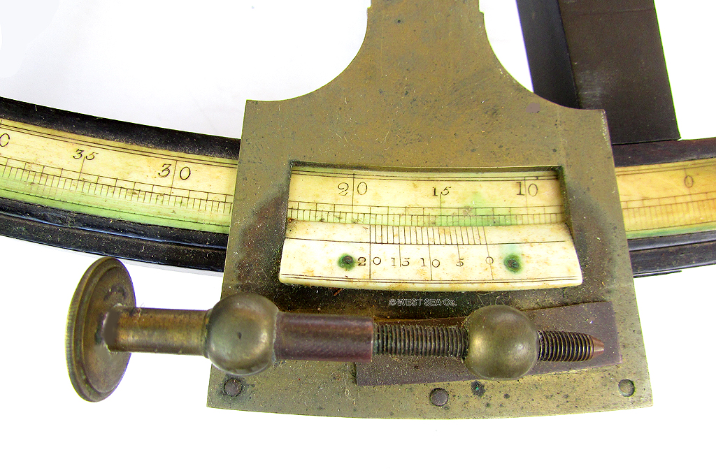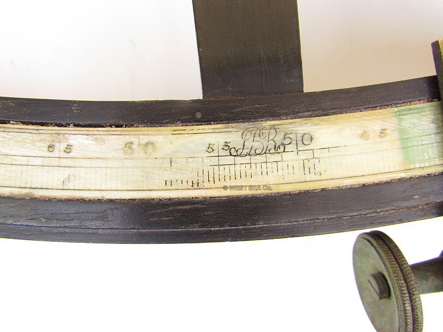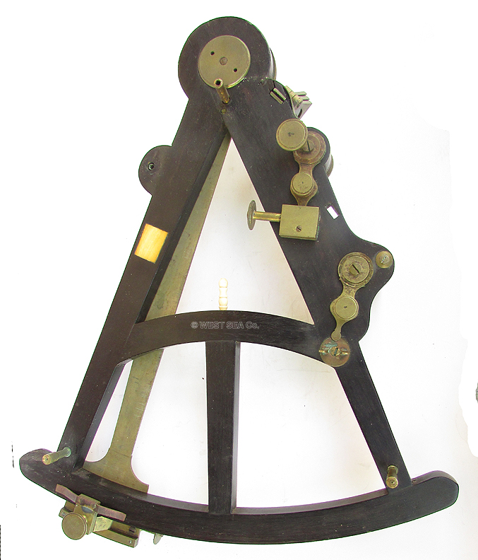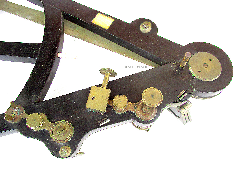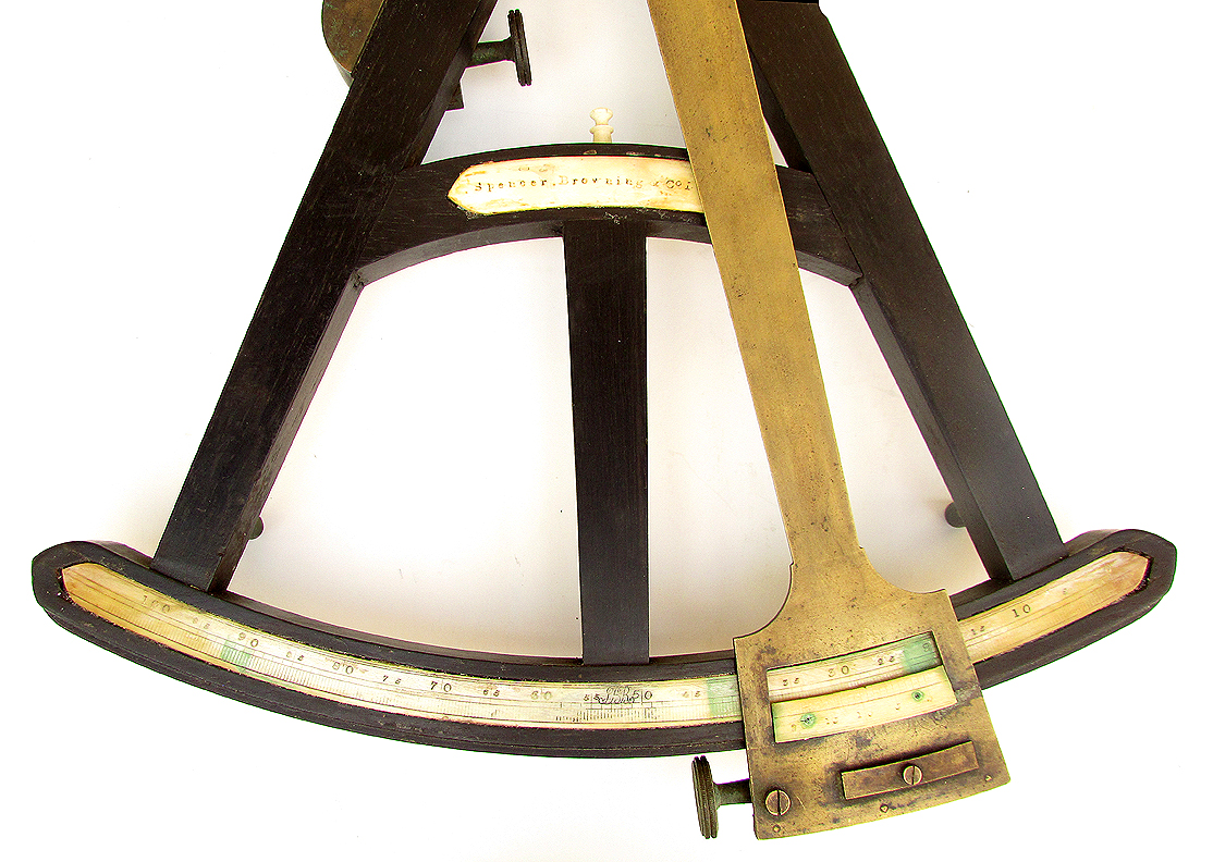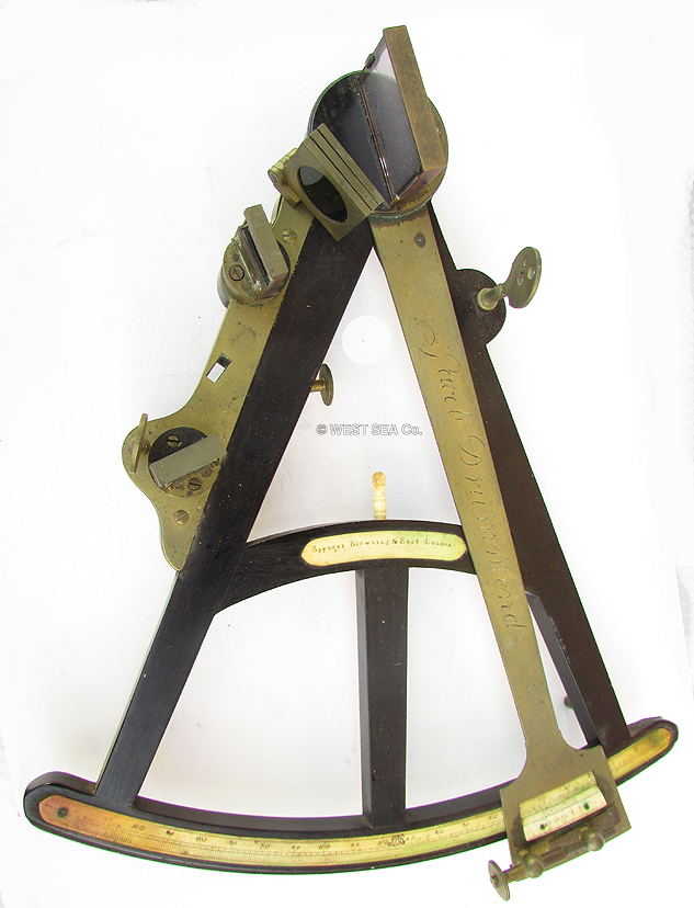 3.61 EARLY OCTANT. First half of the 19th century mariner’s navigational octant by one of England’s most recognized makers. This iconic instrument is signed on the ivory maker’s label on the cross brace “Spencer . Browning & Co. London.” It is of classic form in a triangular shape with an inlaid ivory arc at the bottom. The scale is engraved in degrees from -3 to 103 divided by 20 arc minutes, marked in 5 degree increments. The accompanying vernier scale on the flat index arm reads from 0 on the right to 20 on the left in single arc minutes marked by 5’s, allowing for an accuracy of about 30 nautical miles. This handsome instrument has a solid ebony frame with brass furniture. The flat brass index arm has a large index mirror at the apex and a state-of-the-art (for its time) fine adjust tangent knob. A second knurled brass knob provides a firm stop. This octant is complete with its functional horizon mirror box and full set of 3 pivoting sun filters. Indicative of its early manufacture it has an ivory pencil seated in the cross brace and a trapezoidal ivory note pad inlaid on the reverse for recording sightings. Both of these features are rarely found in extant examples. The back is also complete with its 3 brass “feet” and adjustments for the mirror box. The instrument measures 13 inches tall overall and 10 ¾ inches wide on the large arc. Given its age and completeness, this antique instrument must be rated in “excellent” condition. There is some staining to the ivory components as expected from a long life at sea. Importantly there are no losses or damage. Circa 1845. 795 The much venerated instrument making firm of Spencer, Browning & Rust began their manufactory in 1784. They were certainly one of the most productive nautical instrument making firms in the 18th century. When Ebenezer Rust passed away in 1840, the firm became Spencer Browning & Co. Faintly on the large arc are the initials “SBR” on the scale between 50 and 55, indicating this scale was cut on the original Spencer Browning & Rust dividing engine. (See our article “Evolution of the Sextant” @ https://westsea.com/captains-log/evolutionofthesextant.html) |