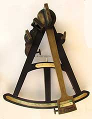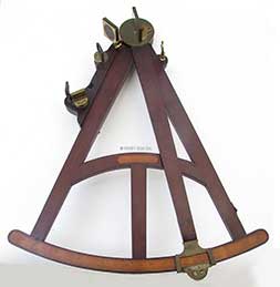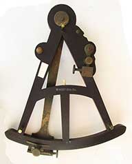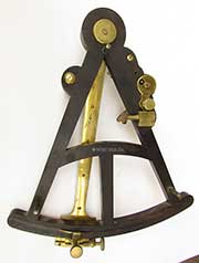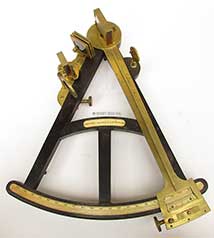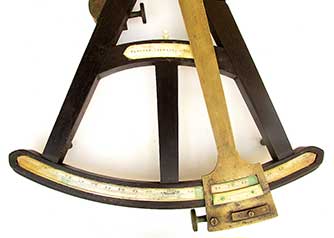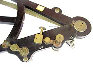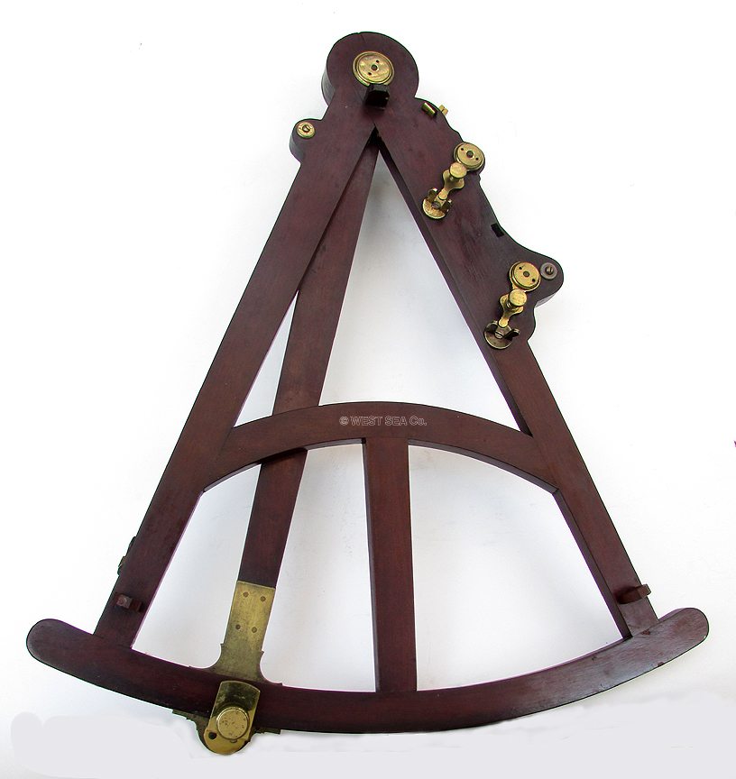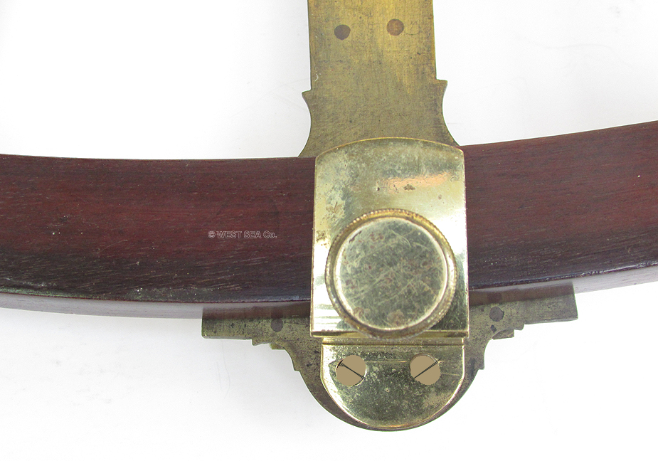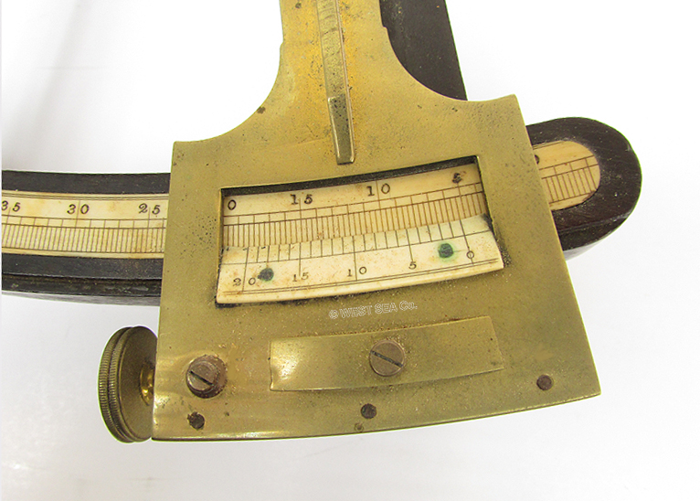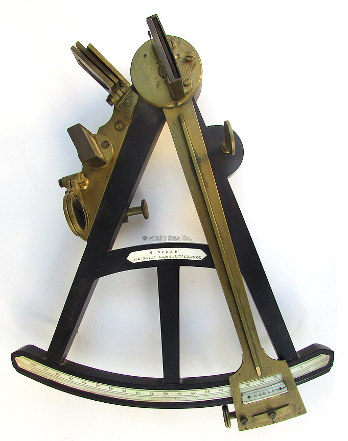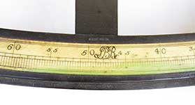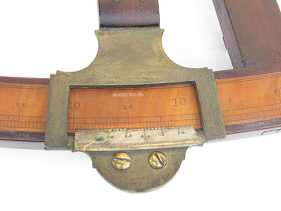 3.61 EARLY OCTANT. First half of the 19th century mariner’s navigational octant by one of England’s most recognized makers. This iconic instrument is signed on the ivory maker’s label on the cross brace “Spencer . Browning & Co. London.” It is of classic form in a triangular shape with an inlaid ivory arc at the bottom. The scale is engraved in degrees from -3 to 103 divided by 20 arc minutes, marked in 5 degree increments. The accompanying vernier scale on the flat index arm reads from 0 on the right to 20 on the left in single arc minutes marked by 5’s, allowing for an accuracy of about 30 nautical miles. This handsome instrument has a solid ebony frame with brass furniture. The flat brass index arm has a large index mirror at the apex and a state-of-the-art (for its time) fine adjust tangent knob. A second knurled brass knob provides a firm stop. This octant is complete with its functional horizon mirror box and full set of 3 pivoting sun filters. Indicative of its early manufacture it has an ivory pencil seated in the cross brace and a trapezoidal ivory note pad inlaid on the reverse for recording sightings. Both of these features are rarely found in extant examples. The back is also complete with its 3 brass “feet” and adjustments for the mirror box. The instrument measures 13 inches tall overall and 10 ¾ inches wide on the large arc. Given its age and completeness, this antique instrument must be rated in “excellent” condition. There is some staining to the ivory components as expected from a long life at sea. Importantly there are no losses or damage. Circa 1845. 795 The much venerated instrument making firm of Spencer, Browning & Rust began their manufactory in 1784. They were certainly one of the most productive nautical instrument making firms in the 18th century. When Ebenezer Rust passed away in 1840, the firm became Spencer Browning & Co. Faintly on the large arc are the initials “SBR” on the scale between 50 and 55, indicating this scale was cut on the original Spencer Browning & Rust dividing engine. (See our article “Evolution of the Sextant” @ https://westsea.com/captains-log/evolutionofthesextant.html) |