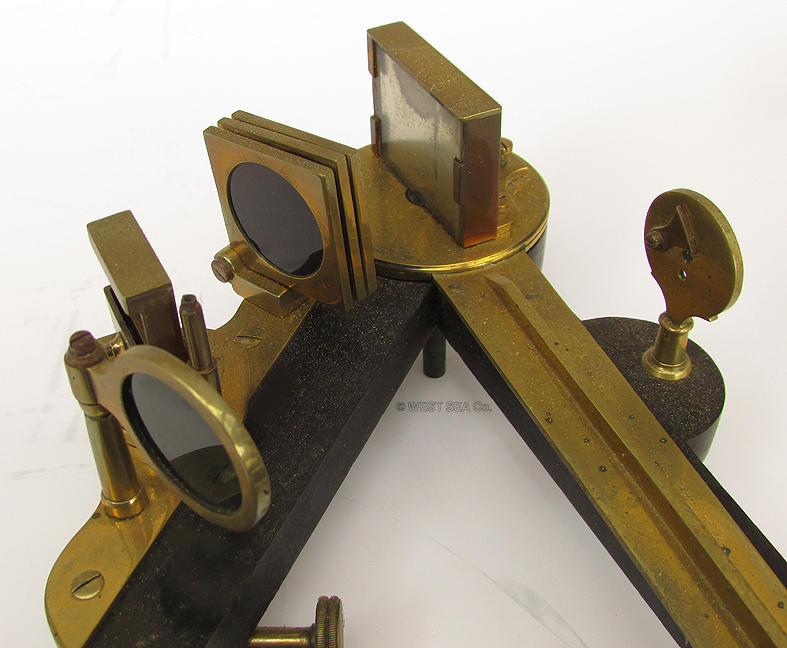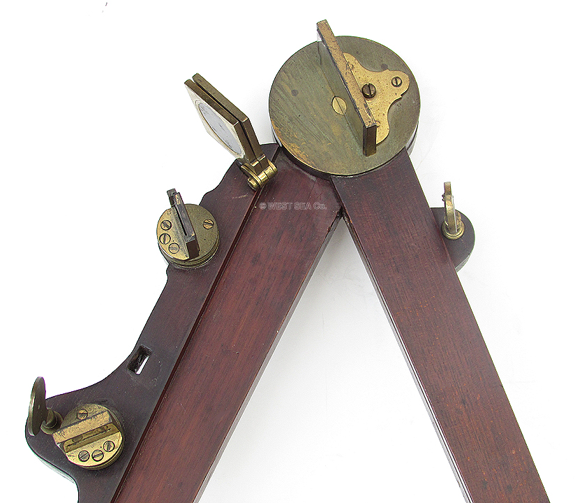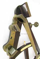 3.38 RARE SURVEYING SEXTANT. Most important, very high quality marine navigational sextant which also served as an astronomical and hydrographic survey instrument. This magnificent all brass precision instrument is signed on the large arc “Cary, London 2842 Gold & Platina.” The large arc is calibrated in single degrees from -5 to 150 degrees divided by 10 arc minutes, effectively making it a quintant. The scale is beautifully engraved on solid gold overridden by a platinum vernier scale. The division of the vernier from 0 -10 allows for a reading to an accuracy of 10 arc seconds. Interestingly the sheet brass frame is very similar to the one invented by Edward Troughton in the 1780’s, in that it is secured to a second frame by screws for rigidity and accuracy. This amazing instrument has many unusual cutting edge features. The index arm stop and the fine adjust tangent screw are spring loaded, allowing a much smoother reading. To take the reading there is a small adjustable magnifier built into the index arm, as well as a small frosted glass window mounted just above the magnifier to provide maximum lighting for the reading. Above the magnifier, mounted to the index arm, is a bubble level which can be locked into place or allowed to swing free indicating the plane of the earth, also known as an artificial horizon. This sextant is equipped with its full set of 4 colored glass index filers and 3 horizon filters for viewing in different atmospheric conditions. Both the index and horizon mirrors are in place and functional. Attesting to Cary’s attention to minute detail, both are equipped with pin-adjusted screws which are covered by threaded knurled caps! This sextant has an adjustable height eyepiece operated by a knurled knob on the reverse. The eyepiece supports a long telescopic sighting tube which fits nicely into the holder with a bayonet twist. The back side of the sextant frame has 3 brass “feet” and a rosewood handle reinforced with brass. But there its commonality with other fine sextants is surpassed. It is mounted, through its handle to an exceptionally heavy and well-machined tripodal stand. The stand is signed “G. LEE & SON, THE HARD, PORTSMOUTH.” It is equipped with 3 knurled leveling screws on a folding base mounted with a support much like a library telescope. At the top is a revolving platform with a tangent locking screw and fine adjust stop. These are for precisely orientating the instrument to the heavens. The tilt of the sextant fore and aft is accomplished by 2 pivoting levers attached to the stand. Each is attached to a brass-encased lead counterweight. The action is flawless! The sextant itself measures 10 ¾ inches wide on the large arc and 10 ½ inches on the index arm. It stands 18 inches high and 10 ¼ inches wide on the base. Circa 1820. Absolutely outstanding condition. As rare as it gets. Museum quality. Price Request |
