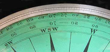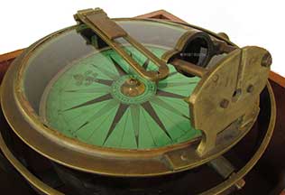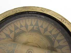 3.13 18th CENTURY COMPASS. Museum worthy mid-1700’s or earlier English-made travelling compass of the finest quality. This handsome instrument features the classic compass rose found on such early instruments. The card is hand-engraved paper set on a mica backing supported on a brass pivot with clear agate bearing. The card is marked in 32 points of the compass with the Cardinal and Intercardinal points identified. North is denoted by a fancy fleur-de-lis and East bears the traditional archaic decoration. The circumference of the card is marked in single degrees identified by 10’s. The center of the card around the pivot is decorated with a subtle octagon design. The card is housed in its cylindrical brass case with scalloped bezel containing old wavy glass. Of special note is the fact that the original press-on cover with knurled rim is still present after 250+ years! 3 ¼ inches in diameter and 1 3/16 inches thick. Virtually pristine original condition showing expected age patina. SOLD The earliest usage of the compass in the Western world took place during the Crusades from Europe to the Holy Land in the 11th century A.D. It was during these Crusades east that the Christian cross became symbolic of the "East" point on the compass rose. The tradition of the "decorated East" point remained with mariners until the late 18th century. |
