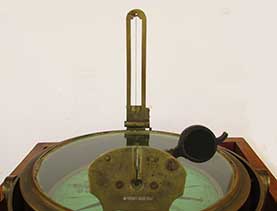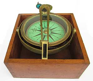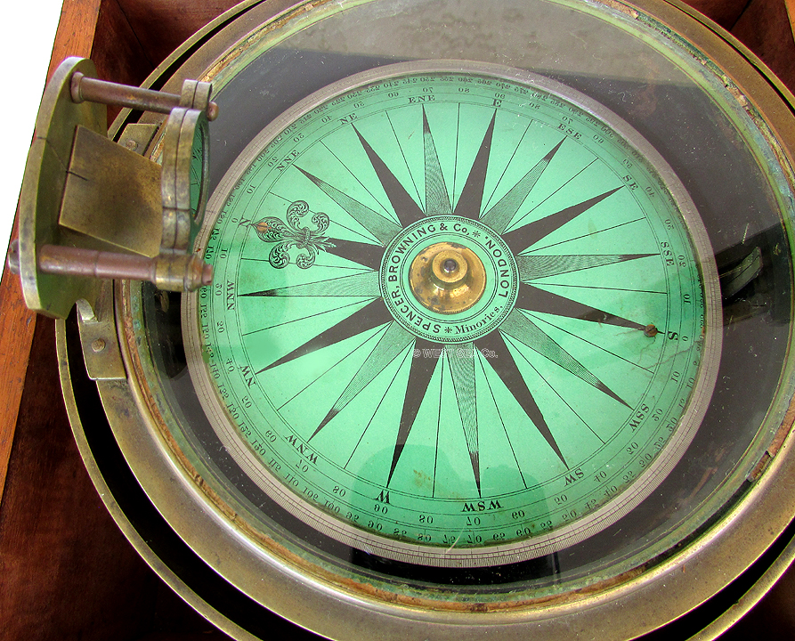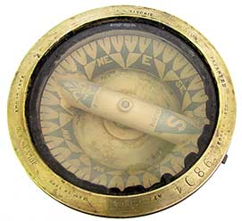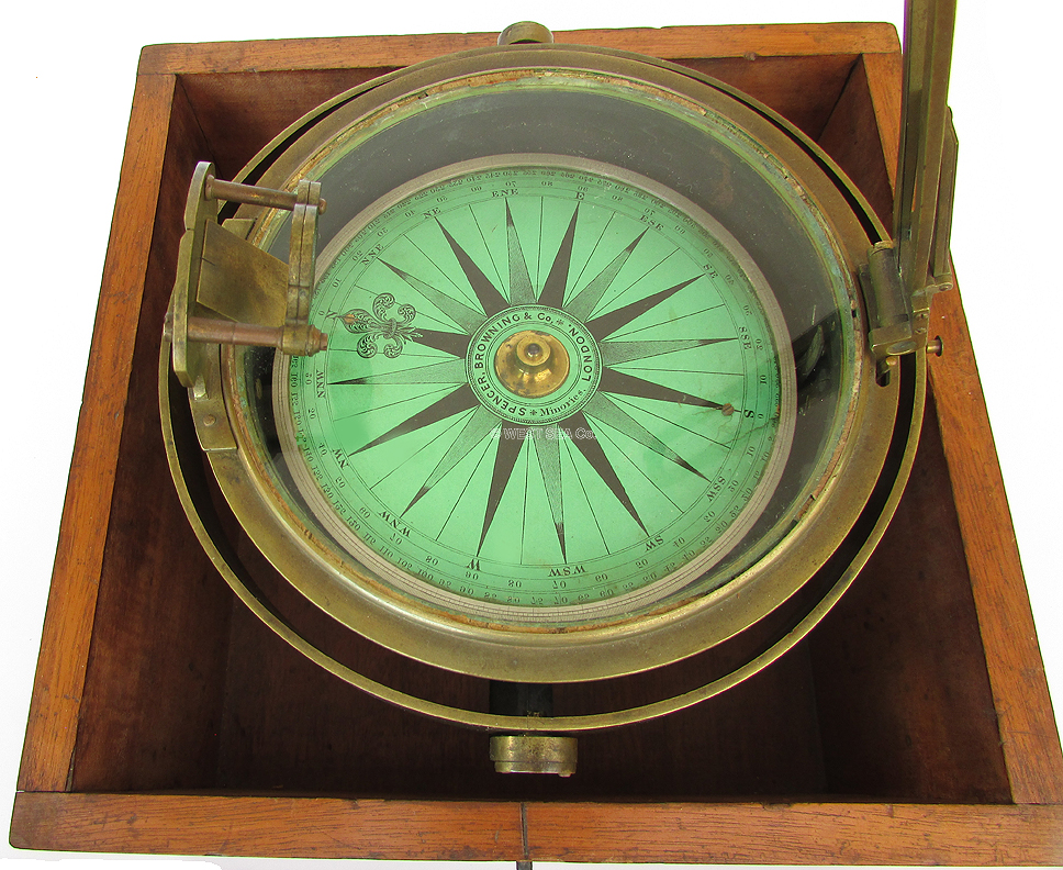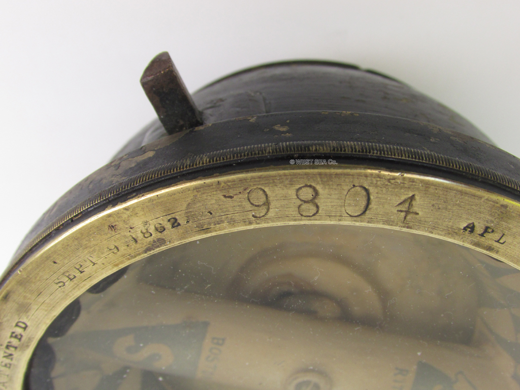 3.43 VERY EARLY COMPASS BY THE INVENT0R. Dated, post-Civil War American ship’s compass by the inventor and manufacturer of the first reliable LIQUID compass as signed on the brass rim “E.S. Ritchie, Boston.” It is further signed inside on the cross float “RITCHIE BOSTON” in the maker’s own hand. This unique configuration, sometimes referred to as a “doughnut compass,” was not the typical flat disc, but rather an inward facing rim supported on 2 tubes. It is marked in one half points of the compass with the cardinal and intercardinal points identified. North is designated by a classic fleur-de-lis. The compass rim bears 5 U.S. patents dates, the first being Sept. 9, 1862 and the last Aug. 17, 1875. A very unusual feature of this liquid-filled compass is that the brass bezel is knurled to literally screw onto the compass body rather than being secured by screws as in most all other compasses. The body has 2 prongs for suspension of a gimbal ring. 5 ½ inches wide from tip to tip. The compass rim is 5 inches in diameter. Excellent original condition exhibiting 150 years of careful use. Remarkably, the compass still contains its original fluid and readily points to magnetic north. 395 Edward Samuel Ritchie was born in 1814. In 1839 he established a hardware business in Boston, Massachusetts with a partner forming the firm of Palmer & Ritchie. From 1842-1849 he operated a ship’s chandlery in New Bedford. In1850 Ritchie began his scientific instrument making career with Nathan Chamberlain as a partner. By 1862 the company was known as Edward S. Ritchie & Co. Then in 1867 the firm name became E.S. Ritchie & Sons.Ritchie is credited with inventing the first practical liquid-filled compass circa 1860. In 1861 he produced a compass for the famed Civil War iron clad USS MONITOR and was awarded his first patent for the invention on September 9, 1862, at the height of the war. A number of improvements and subsequent patents followed. The elder Ritchie died in 1895, but his sons carried on the business, which still survives today as E. S. Ritchie & Sons, Inc. Pembroke, Massachusetts. |