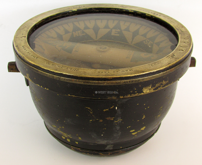3.03 EARLY AMERICAN NAUTICAL COMPASS. Really exceptional maritime compass of unusally small size produced by the short-lived American scientific and nautical instrument making firm of “FRYE & SHAW * NEW YORK*” as hand-engraved around the pivot of the compass card. This high quality functional ship’s compass has a paper over mica drycard compass rose marked in single points of the compass with the cardinal and sub-cardinal pointes identified. North is designated by a classic fleur-de-lis. The brass pivot is of conical form reminiscent of compasses dating back to the 17th century! Also in keeping with tradition, the East point is embellished with yet another fleur-de-lis. The card is housed in the weighted brass bowl slung in gimbals mounted in its heavy brass cylindrical housing complete with the original press-fit knurled brass lid. The compass is very lively, accurate, and gimbals properly. The presentation measures 3 5/8 inches in diameter and 2 inches thick with the lid. Condition is absolutely outstanding and original, in all respects. Totally original. This is a sweetheart of an offering, worthy of any museum. Not esspcially cheap, but offered here before inflation. Worth every penny. Try to find another! 888 |