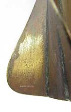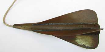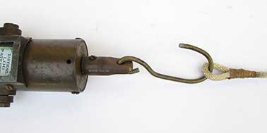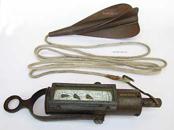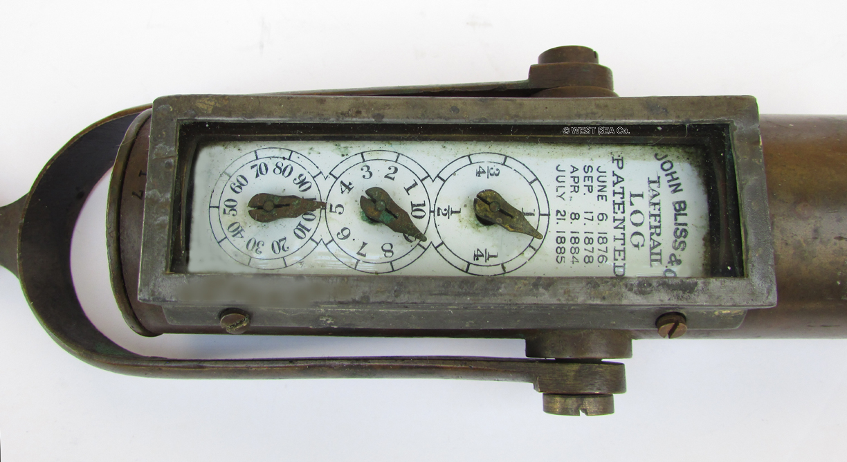 3.47 CLASSIC TAFFRAIL LOG. The ultimate in 19th century American taffrail logs as designed, patented and manufactured by John Bliss & Company in the late 1800’s. This pristine example has a hard-fired porcelain register signed “JOHN BLISS & CO. TAFFRAIL LOG PATENTED.” The first of 4 dates is 1875 and the last is “July 21, 1885.” This heavy solid brass log has a cylindrical body with a U-shaped bracket for attachment to the ship. The working end consists of a rotating shaft connected with internal gearing and exiting with a brass hook for attachment to the line carrying the fish (spinner). The attachment is made with period cotton line connecting to the 4-finned brass spinner which is marked “JOHN BLISS & Co.” on one of the blades. Excellent original condition showing actual use. The log assembly measures 13 1/2 inches long overall from the eyelet attachment to the ship to the bottom of the brass hook attaching the line. The body of the log is 2 inches in diameter, not counting the suspension bracket which is 2 3/8 inches wide. The fish (spinner) is 9 ½ inches long and 4 inches wide. Several feet of the original cotton line remain. SOLD |