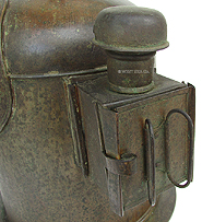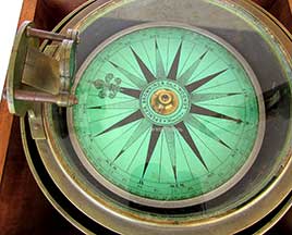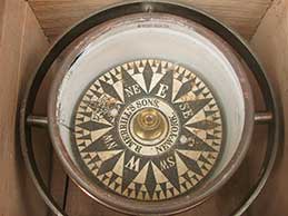 3.79 VERY EARLY AMERICAN BINNACLE. First quarter 1800's boat binnacle by the esteemed American makers Samuel Thaxter and his son as indicated around the pivot point of the drycard compass "S. THAXTER & SON. Boston." This very rare navigational instrument has a heavy solid brass housing. Within is contained the high grade drycard compass marked in points of the compass rose down to ½ points, with the cardinal and intercardinal points identified. Speaking to its quality it has an agate bearing in the brass pivot and the card is backed by mica. Two other significant attributes are its decorated east point, and the fact that the innovative compass bowl is brass and not wood, as used up until about 1820. We were told by the original owners this compass is dated "1818," but we have not opened the body to confirm. The compass bowl and its gimbal are supported within the very substantial binnacle housing with glazed viewing port. The top is fitted with a heavy duty suspension ring for portability. The side bears an auxiliary lamp for night viewing. It contains a small font with whale oil burners – again, a testament to its early origins. The compass measures 5 ½ inches in diameter. The cast brass binnacle base is 9 ½ inches in diameter and the binnacle stands 11 ½ inches tall exclusive of the ring. Totally complete and in excellent original condition in all respects, showing its great age. 1179 |