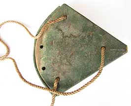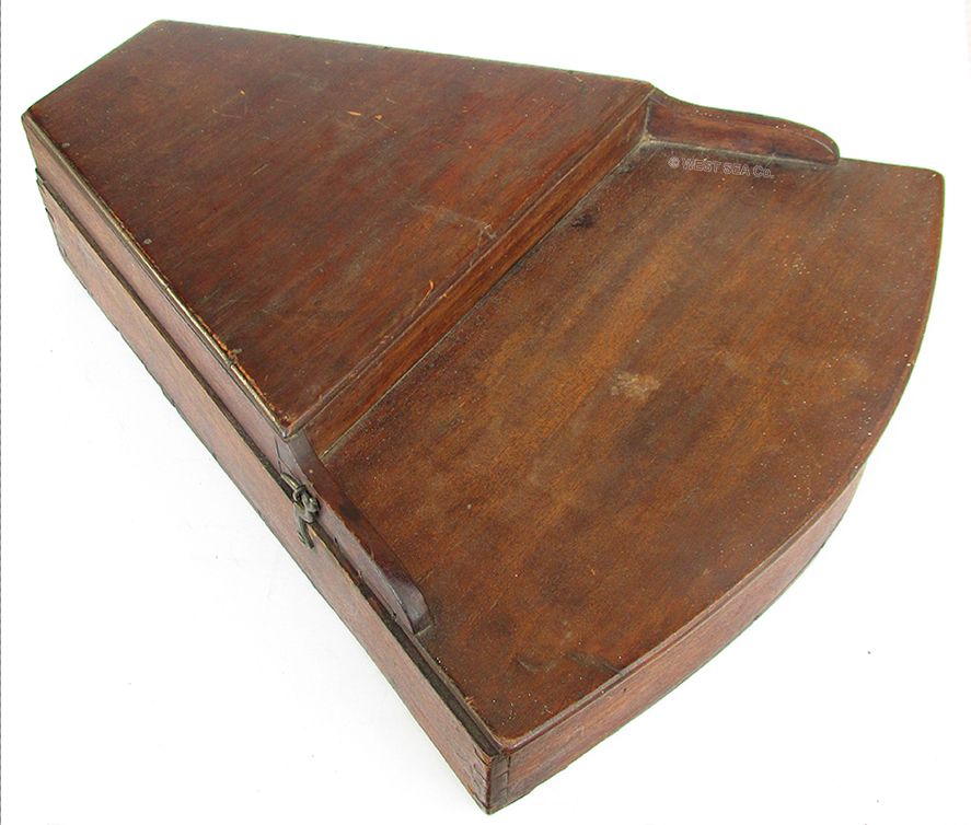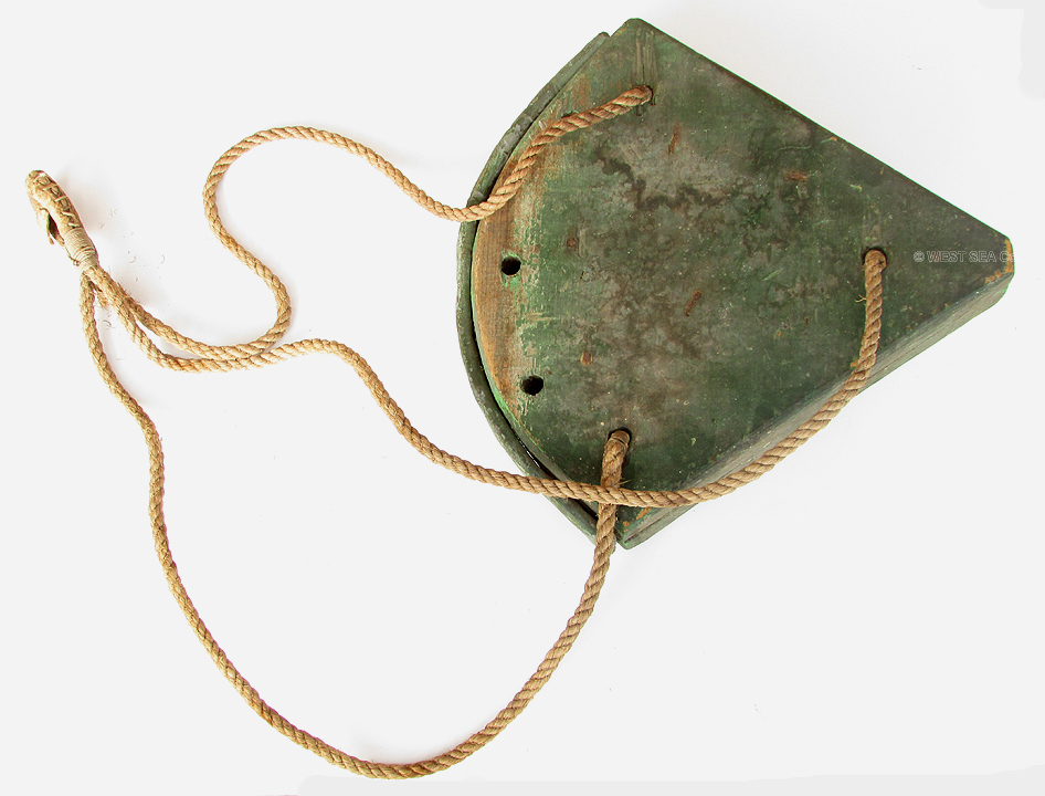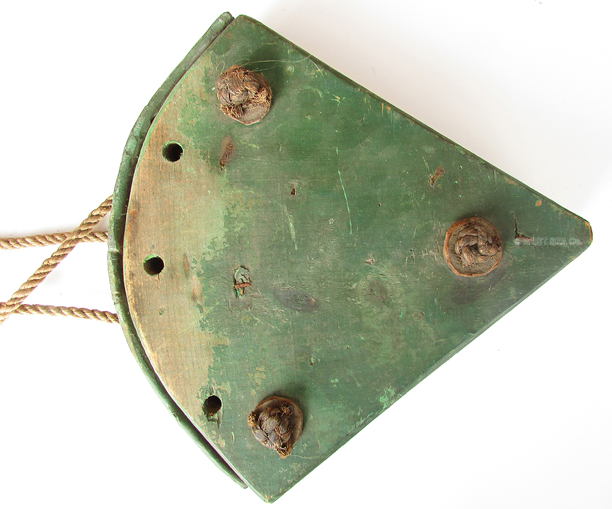 3.60 CHIP LOG. Offered here is a virtually non-existent example of a late 18th century or very early 1800’s log used to measure a sailing ship’s speed. This “chip log” so named from the 1500’s when a wooden chip (literally a log) was thrown over the side. The time it took to pass by was measured with a sand timer to determine the ship's speed. Hence, the distance the ship had travelled was calculated. Later, a more sophisticated form evolved in the 1700’s. It consisted of a triangular wooden board, with a lead weight attached to its curved edge. On this rare surving example, a three holes are drilled in the surface to allow passage of sea water. At the three corners of the triangle are hemp lines rove through with leather grommets and rose head knots... all done in very ‘marlinspike seaman' manner. The three lines terminate some 22 inches above in an eyelet seized with small stuff covered by a sewn leather sheath. In practice, the log was thrown over the side and floated vertically owing to its lead weight. As such, in theory, it retained its position in the seaway as the ship sailed on. 11 ¼ inches tall by 11 ¾ inches wide and 1 ¾ inches thick. The painted pine surfaces retain their very desirable old ‘Colonial era’ green paint. Excellent overall condition showing good actual use, but no abuse. This is a RARE, early navigational relic from the age of sale of unusually large size! Definitely a museum piece, very reasonably priced! 395 Peabody Museum curator M.V. Brewington in his monumental navigational instrument reference book, “The Peabody Museum Collection of Navigating Instruments,” 1963, Peabody Museum, Salem Massachusetts, lists 3 examples in the museum’s prestigious collection on page 83. All three logs are nearly half the size of the example offered here. From the Middle Ages, the earliest form of dead reckoning navigation incorporated the use of a chip log and timer. The distance travelled by the ship was measured in “knots” tide in a line, the passage of which was timed by a sand glass. By the early 1800’s this practice gave way to the taffrail log, invented by Edward Massey, which recorded the ship’s travel mechanically using a rotating “fish” connected to a geared counter. |
