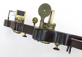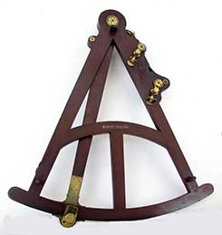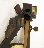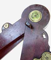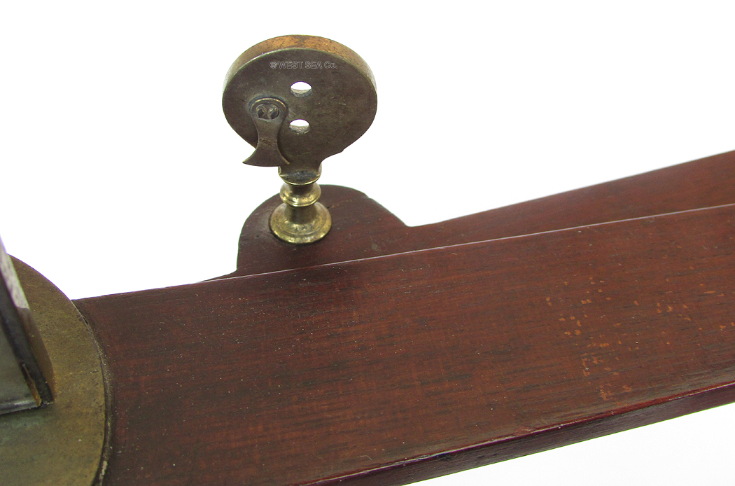 3.64 18th C. MARINER’S QUADRANT. Incredibly rare, especially early navigator’s quadrant of the Hadley type. This museum-quality navigational instrument was constructed soon after John Hadley introduced his innovative double-reflecting quadrant design to England’s Royal Society in 1731. This handsome instrument has a mahogany frame with brass furniture and an inlaid boxwood scale reading from -4 to 94 degrees calibrated in 20 arc minute increments. Its long mahogany index arm with riveted brass tip bears an ivory vernier. It is the early 0-centered “Type A” configuration reading from 0 to 10 arc minutes on the right and 15 to 0 on the left. Such an arrangement allowed a theoretical accuracy of 1 arc minute (or 1/60th of a degree). This instrument is complete with both index and horizon mirrors AND backsight mirror. Indicative of its early form it has an adjustable peep sight AND a backsight! Also telling of its early age are the two (not 3) interchangeable sun filters. The index arm is 18 ¾ inches long and has a simple brass thumbscrew stop. The back is complete with all three early form wooden “feet” and mirror boxes adjusting apparatus. The arched frame brace is inlaid with a blank boxwood maker’s label. Undoubtedly this high-quality instrument was made by one of the great early scientific instrument makers the likes of Adams, Cole, Gilbert, Nairne and Urings. The broad scale is 16 ½ inches wide. Outstanding original and complete condition after 275 years! 3349 Hadley’s contribution to navigation was acknowledged by the Royal Society with a £250 reward in 1732. Yet the response by the average uneducated seaman and traditional maritime community was slow to include the instrument into fleet-wide navigation until after 1750. Even then, mariners familiar with the 16th century backstaff still relied on it as an accepted navigational tool well into the 19th century. * Peter Ifland, “Taking The Stars, “ page 56. |