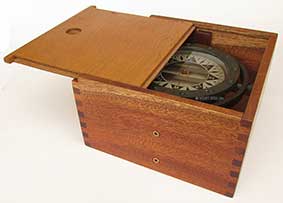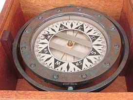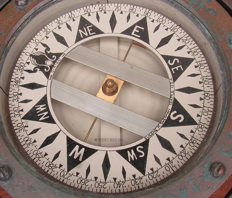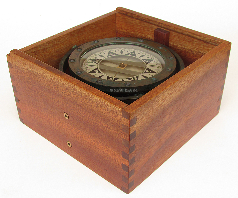 3.65 BOXED COMPASS. Large, early 1900’s American boxed compass. This liquid-filled compass has a north point marked on the composition card “Trade DIRIGO Mark” below the classic fleur-de-lis. The bottom of the card is marked “”EUGENE M. SHERMAN SEATTLE U.S.A.” The open face card is calibrated in points of the compass down to ½ points with the Cardinal and Intercardinal points identified. The brass center is a high quality pivot connecting 2 large bar magnets. The heavy brass compass body measures 5 1/2 inches in diameter and is slung in its substantial brass gimbal. The gimbal is mounted in a beautiful custom-made mahogany box of dove-tailed construction with sliding oak lid. The box measures 8 inches square and is 4 1/2 inches thick. Excellent condition in all respects. The compass is lively and very accurate. A rare, larger example of this famous compass maker’s output. 295 The well-known Dirigo compass was first manufactured in Lexington, Massachusetts by boat builder and violin maker Eugene M. Sherman in 1907. Sherman was born in Somerville, Massachusetts to a New England seafaring family in 1872. “Dirigo,” translated from Latin means “I Lead.” In 1911, Sherman moved to the Pacific Northwest where he opened his compass making business in Bellevue, Washington. This compass dates to his early manufactory. He sold his stake in the company in 1944. |