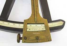 3.04 NAVIGATOR's PROTRACTOR. Patented 19th century American navigational device which consists of a T-square mounted on a long brass arm over which a brass circle with compass rose is mounted. The circular rose is divided to ¼ points of the compass with the cardinal and intercardinal points identified. North is designated by a classic flue-de-lis. The rose is mounted in such a way that it slides the full length of the supporting arm while being able to rotate a full 360 degrees. The pivot point is off center allowing for cross hairs to pinpoint the precise point on a chart. This ingenious device is of all brass construction. It is stamped with maker's mark "J. W. STRANGE Manufacturer, BANGOR, ME." It is additionally marked"Pat'd June 13. 1876." The long arm measures 16 inches in length and the cross bar 4 ½ inches. The disc is 4 inches in diameter. Outstanding original condition with nice golden lacquer surfaces, virtually the same as it was when made 140+ years ago! A very rare American navigational relic. 389 |