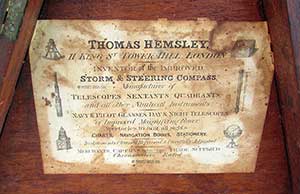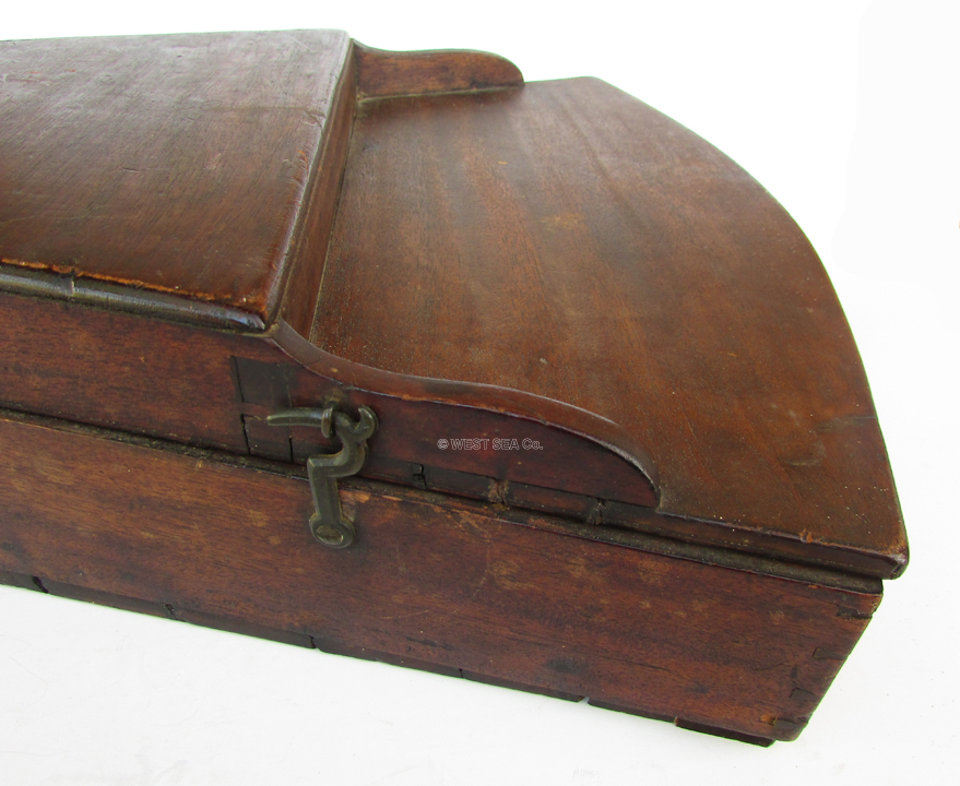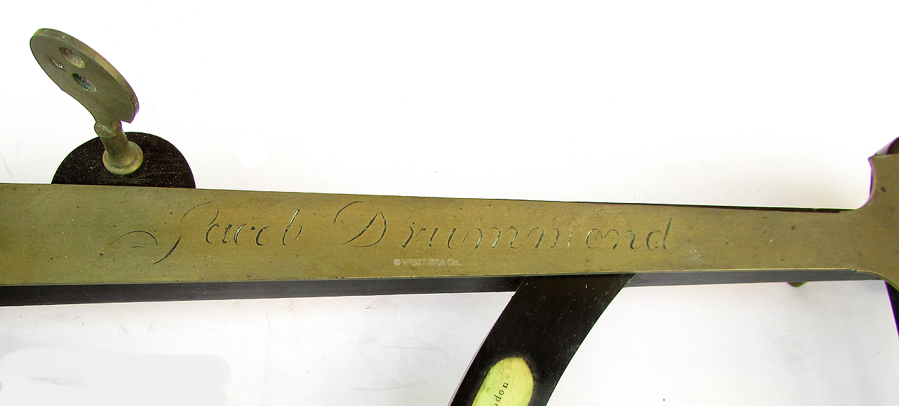 3.68 EARLY MARINER’s QUADRANT. Here is a very special example of a late 18th or turn-of-the-19th century navigational instrument by one of England’s foremost makers. The ivory maker’s plaque is engraved “Spencer Browning & Rust London.” This classic double reflecting instrument, later known as an “octant,” has an ebony wooden frame with brass furniture and ivory scales. The large ivory arc is divided in single degrees from -2 to 99, marked by 5’s, subdivided in 20 minute increments. The scale was calibrated on the firm’s famous 18th century dividing engine as indicated by “SBR” stamped at its mid-point. The flat brass index arm is fitted with an ivory vernier scale reading from 0 to 20 arc minutes right to left. This afforded the observer a reading with an accuracy of about 1 minute (one nautical mile). Innovators that they were, SBR incorporated a positive stop on the back of the arm coupled with a fine adjust tangent screw. This advancement was later incorporated in all such angle measuring devices well into the 20th century! Of great significance to its value, this quadrant is engraved with the Captain’s name in script on the index arm. It reads “Jacob Drummond.” This instrument has both index and horizon mirrors and all 3 index filters. The peep sight is of early form with two apertures and an unusual circular pivoting shutter. Also attesting to its early age is the vestigial back sight with mirror. That feature became obsolete and was no longer used by 1820. But in keeping with its early style, the index filters are replaceable for either the foresight or backsight functions. The back of the instrument is totally complete. It has notable features: The mirror box is adjustable with a knurled knob allowing for a much finer adjustment than earlier “ butterfly” hand adjustments (which it still has for its out-dated backsight)! There are 3 brass “feet” for positioning in its box and an ivory note pad for recording readings. To these ends, it retains its rarely-found ivory pencil within the cross brace. This instrument is housed in its original stepped keystone case. The case adds significantly to the value of this offering. Firstly, it is made of very dense African mahogany of the finest quality. Secondly, the construction is with fine, hand-fitted dovetails. Thirdly, the box has a very unusual internal mount which securely holds the instrument in place. Fourthly, the case has very decorative serpentine extensions reinforcing the box. We have not encountered this exceptional detail in our 45+ years in the business. The box is complete with both hook and eye closures. Lastly, there is the very decorative later servicing label of “Thomas Hemesley11 Kings Street, Tower Hill, London” in the lid depicting early navigational instruments of the era. The quadrant measures 14 inches long on the index and 11 ¼ inches wide. The box is 15 ¼ inches long by 13 ¾ inches wide and is 4 inches thick. Overall condition is outstanding all respects, considering this instrument is at least 225 years old! 1600 According to M.V. Brewington, curator of the Peabody Museum, Salem, Massachusetts and author of the reference book “The Peabody Museum Collection of Navigating Instruments” 1963, “There are more extant instruments by this firm than any other. It would appear that the firm sold wholesale to dealers all over England and America. The firm first appears in the London Directories in 1780 and High Street, Wapping , London. In 1843 the name was changed to Spencer, Browning & Co.” Thomas Hemsley II worked as an optician, mathematical instrument maker and nautical instrument maker at Sing Street, Tower Hill, London beginning in 1828. (Gloria Clifton, “Directory of British Scientific Instrument Maker 1550 – 1851”, 1995, The National Maritime Museum, and Zwemmer, Philip Wilson Publishers.) |