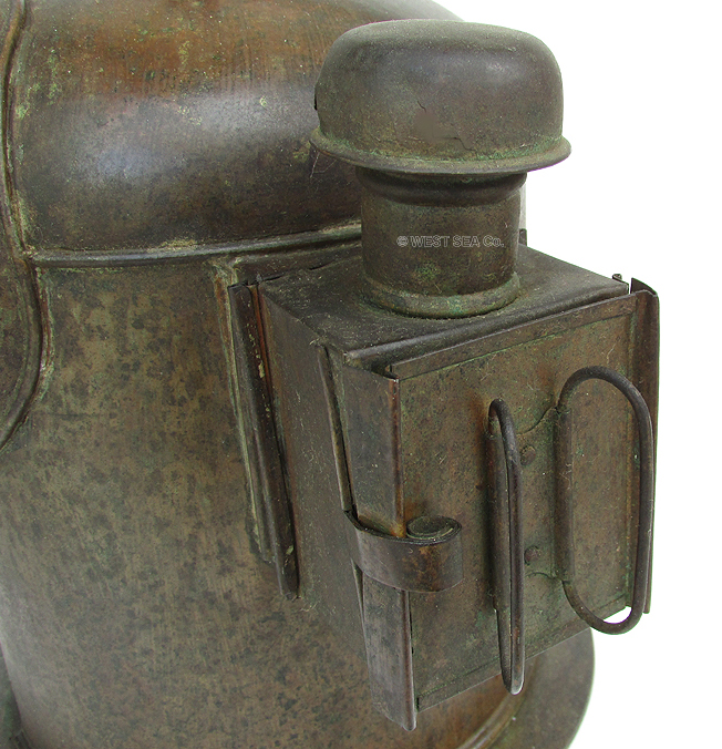 3.50/5.69 NAVY LANDING CRAFT BINNACLE. Authentic World War II vintage U.S. Navy small craft binnacle compass as used on the larger American amphibious assault craft of the era such as the LCU and LCM. This handsome example is made of heavy solid cast bronze containing a liquid compass. It bears the maker’s plaque reading “Naval Ship’s Systems Command Compensating Binnacle Mark VII Mod 5” and is signed “John Hand & Sons, Cherry Hill, N.J.” The black compass card with luminescent markings is calibrated in 5 degree increments of the compass rose, marked by 30’s with the Cardinal points “N, S, E, W.” identified. The helmsman’s side of the binnacle is marked “AFT” and bears correction markings for adjusting the compass. To these ends, the original compass correction card in 4 columns is displayed. Two are marked “Magnetic Course” and the 2 others “Compass Course.” Within the binnacle body is a complex series of magnets and gears for making magnetic adjustments. Interestingly the inside of the folding brass cover is insulated with an early style cork liner. What is remarkable is it comes complete with its rarely found protective all bass cover which contains “CORRECTION INSTRUCTION” in the underside of the lid. This very substantial precision navigational instrument weighs a hefty 8+ pounds! It measures 5 inches tall and is 4 ½ inches in diameter. The compass is lively and accurate. The cosmetic condition of the entire presentation is exceptional. 495 |
