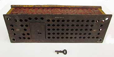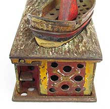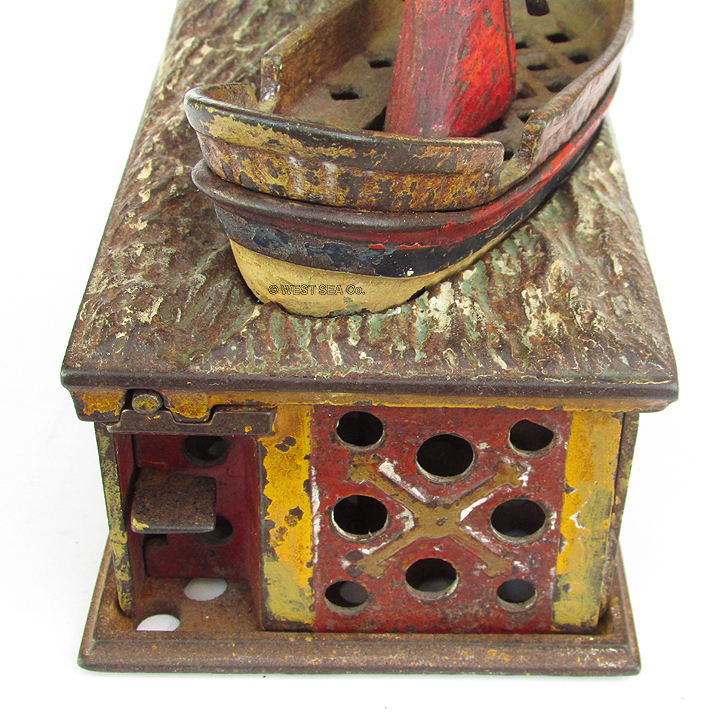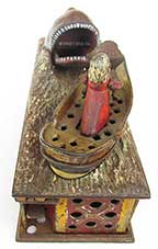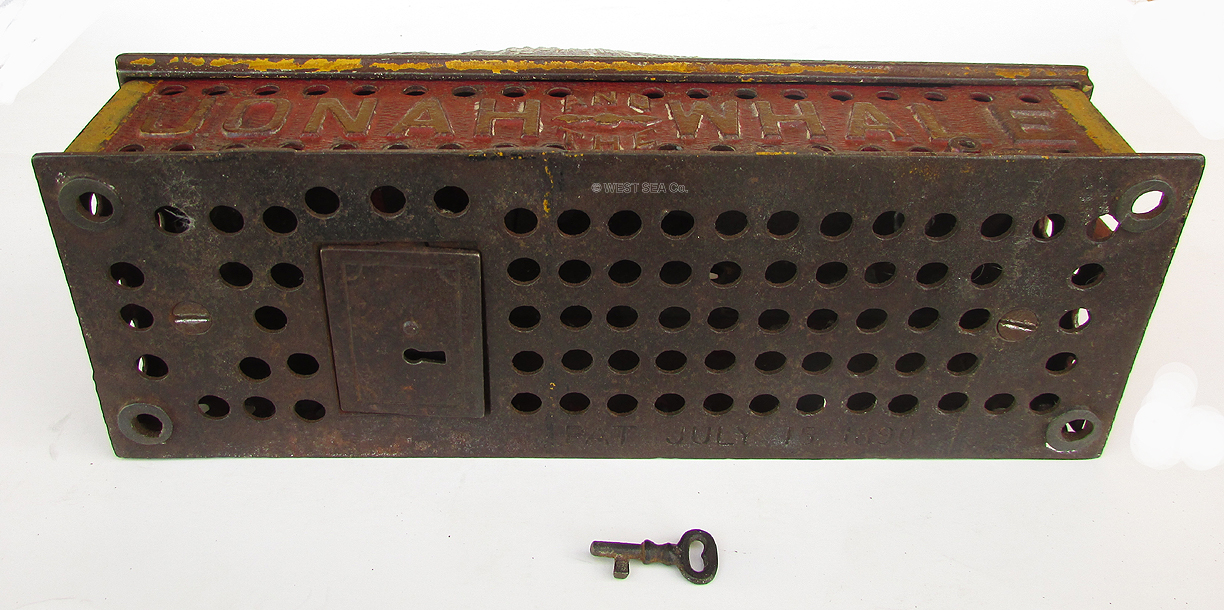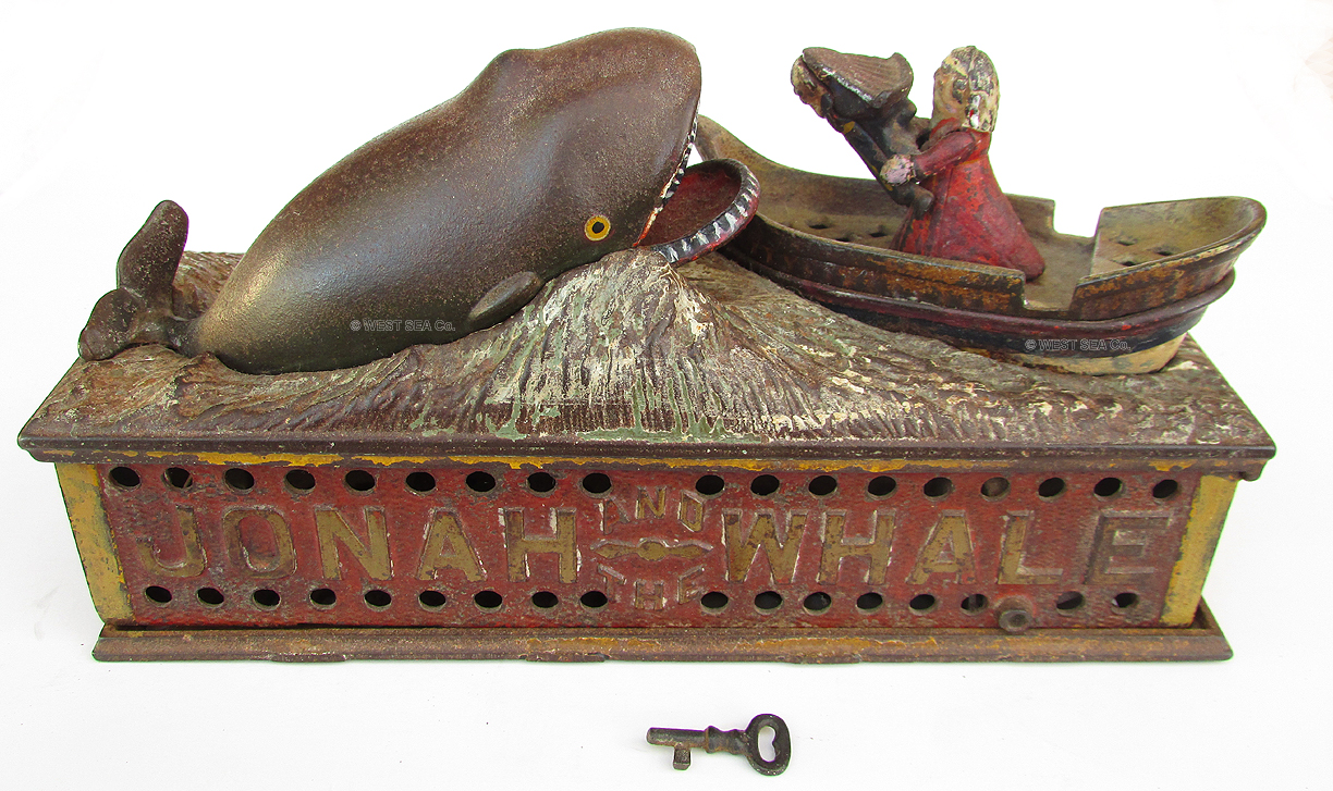 4.51 EXTREMEELY RARE MECHANICAL BANK. Absolutely charming, 19th century savings bank boldly marked “JONAH AND THE WHALE” on both sides of the base in raised letters. In whimsical fashion it depicts God with long hair and white beard in a flowing red cape standing in a small boat. In his arms he holds the hapless effigy of Jonah in front of the waiting jaws of a huge whale. Above Jonah’s head is a platform on which a coin may be placed. When depressed, a spring -loaded lever at the end of the bank swiftly delivers the coin into the whale’s mouth! Cleverly-designed, the whale’s agape mouth pivots up and down adding an uncanny realism to the action. The entire bank is made of heavy cast iron. The end opposite the lever is marked “BANK” in relief. On the bottom of the bank is a locking trap door which allows access to the interior locked “safe.” Amazingly, the original skeleton key for the lock is still present! Important to the value of such banks is the originality of the surfaces. This bank is in pristine original condition with fully 80% or more of the original paint still present. The bottom of the bank is impressed “PAT JULY 15 1890.” 10 inches long, by 3 3/4 inches wide and 5 inches high. Excellent original condition throughout with no damage or modifications. The action of the bank is just as it was over 135 years ago! 4300 After a thorough research of comparable prices for similar banks, we have not found any bank of this quality or originality. Other prices are as high as $12,500. If you find an example in similar or better condition, we will match or better the price. |
