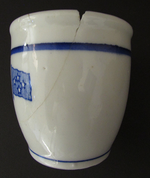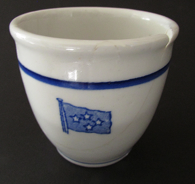 5.79 ADMIRAL’s CUP. Very rare, World War II or earlier “watch stander’s” type cup bearing the flag of a full 4 star Admiral! The bottom of the cup is marked “TEPCO Vitrified China Made in U.S.A.” 3 ¼ inches in diameter by 3 ¼ inches high. There is a significant crack with chip in the upper right rim. Priced accordingly. Nevertheless, this cup was once in the possession of a recognized wartime Naval commander of major importance. If only it could talk! 29 |
