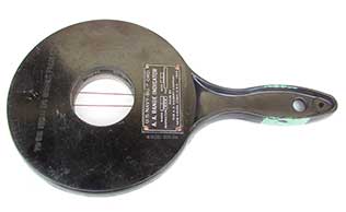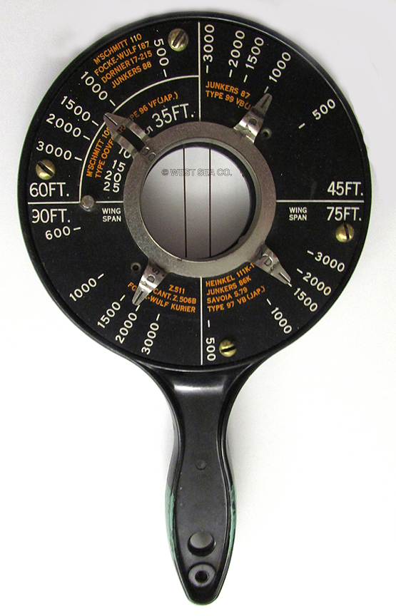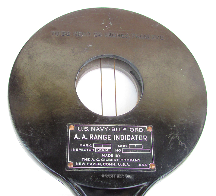 5.80 NAVY AIRCRAFT RANGE FINDER. Authentic World War II U.S. Navy range finder used to assist in shooting down enemy aircraft. The back of this hand-held device bears the riveted maker’s label reading “U.S. NAVY BU ORD. A. A. RANGE INDICATOR Mark I Mod. 1 Made by the A.D. Gilbert Company New Haven, Conn, U.S.A. 1944” This early Bakelite computer uses parallax to determine the distance from an incoming aircraft to the observer. Using a cleaver system of levers and gears attached to 4 metal pointers, the two central wires were to be aligned with the aircraft’s “WING SPAN.” The pointers indicated the distance to the aircraft in feet. Obviously, it was incumbent on the observer to first identify the type of aircraft. Then, depending on that identification, several types of aircraft could be ranged from 500 to 3,000 feet away. Those included: “M’SCHMITT 109, TYPE OOVF (JAP.) TYPE 96 VF (JAP.), M’SCHMITT 110 FOCK-WOLF 187, DORNIER 17-215, JUNKERS 88, JUNKERS 87, TYPE 99 VB (JAP.), Z.511, CANT. Z 506B, FOCKE-WOLF KURIER, HEINKEL111K-115, JUNERS 86K, SAVOIA S.79, TYPE 97 VB (JAP.)” All are identified in incised orange lettering around the circumference. The back of the instrument is embossed “TO BE HELD 24 INCHES FROM THE EYE.” The instrument is 5 3/8 inches in diameter and 9 ½ inches high. It is in perfect original, functional condition. A very unusual wartime relic from World War II. WAS $395 NOW! 139 The use of optical range finding on land and sea was pioneered as early as the Civil War. It was obviated by the invention of radar in the Second World War. Yet this holdover of the antiquated technology still lingered as late as 1944. This example’s pristine condition is a testament to its obsolescence. |