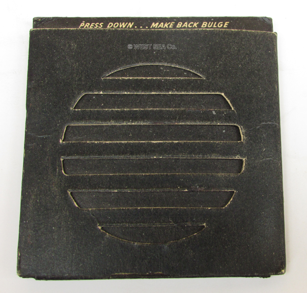 5.82 SIGNALMAN’s TRAINING DEVICE. World War II or earlier hand-held teaching aid for training Navy signalmen to send Morse Code using flashing light. This ingenious device is made of stiff cardboard with louvers simulating a signal light for transmitting “INTERNATIONAL MORSE CODE” as indicated on the back. All 26 letters of the alphabet and numbers 0 - 9 are indicated with their corresponding code. The front is marked “PRESS DOWN… MAKE BACK BULGE,” cleverly simulating the emission of light. The back is marked “Patent Pending.” 2 ½ by 2 5/8 inches. Outstanding original condition. A rare, fragile survivor in working condition. 25 |