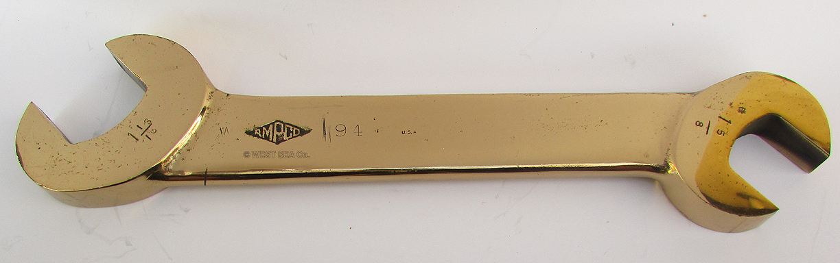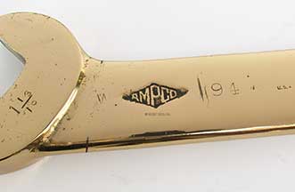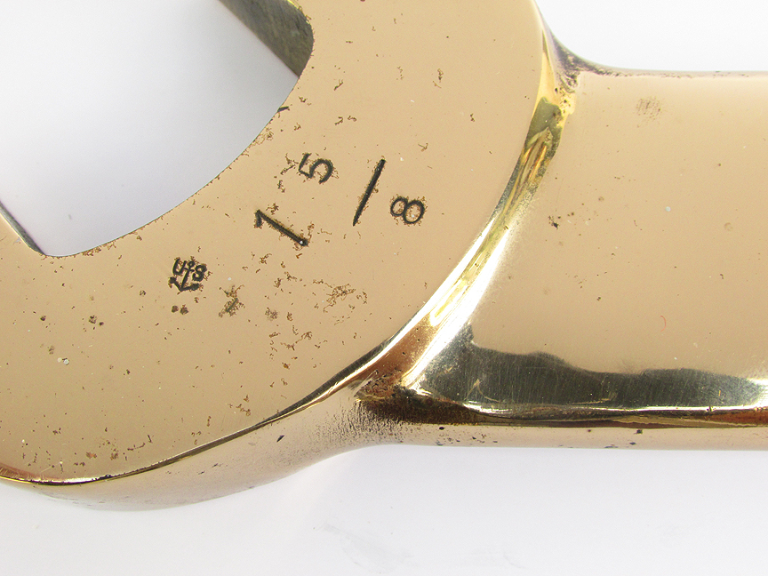 5.88/6.62 BATTLESHIP WRENCH. An especially rare survivor from the powder magazine of a World War II American battleship. This impressive tool is solid bronze. Although unmarked, it could very possibly be Beryllium Bronze (CuBe), an extremely rare and valuable alloy originally used in high tech aviation applications and for non-sparking tools used in dangerous environments with combustible fuels and explosives. This massive wrench is marked <AMPCO> with the date “194 “ stamped “U.S.A.” On the reverse it is stamped “ORD-SB” indicating it was used in the ordnance department. The dual ends are marked “1 13/16” and “1 5/8” respectively. The latter is also stamped with the Navy Inspector’s mark . 16 ¼ inches long by 4 inches wide at the widest. 5 ½ pounds. Fabulous original condition in a high luster polish. If this can be proven to be the CuBe alloy, it is worth more than our asking price in scrap value alone, not withstanding its historical value! 249 |