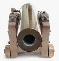 6.33 EXCEPTIONAL YACHT CANNON. “THE” most highly sought after 19th century American yacht signaling cannon “MADE BY H. BROWN & CO. NEW HAVEN CT U.S.A. LAVIGNE’S PAT. JULY 31-86” as marked on the top of the breech. This incredible cannon is unusually large for yachting. The length of the barrel itself is a full 2 feet with a bore of just under 1 ½ inches! It is made of solid gun metal bronze and the breech is fitted with a unique closure incorporating a lanyard-fired percussion system. The cannon is supported in its heavy brass trunnion mounts which allow elevation through a wide range. The original wooden carriage is made of dense mahogany with brass fittings including 4 rings for securing and numerous acorn nuts. There are two small wooden wheels for ease of moving this heavy assembly weighing over 100 pounds! The patented breech block operates smoothly with a tight fit. The spring-loaded firing pin is released by pulling the remotely-operated hand lanyard which has a stout brass pull ring. Once fired, the expended shell is removed by the finger shell extractor. As an added bonus this cannon comes with a custom-made knurled aluminum insert which allows the cannon to be fired with a much smaller 10 gauge shotgun shell. The barrel is 27 ¼ inches long inclusive of the breech. The whole unit is 30 inches overall from the muzzle to the rear of the carriage. Thge bore is 1 7/16 inches 37mm) on the inside diameter, making this cannon a 1.5 gauge. It stands 11 inches high. Excellent original condition in all respects. The cannon and its fittings have acquired a lovely statuary bronze age patina.Price Request The R. H. Brown Company began business in New Haven, Connecticut in 1888 manufacturing yachting and signaling cannons. After a relatively brief but illustrious career, the company closed its operations in 1912, the same year as the infamous TITANIC disaster. |
