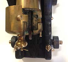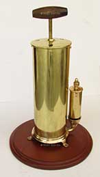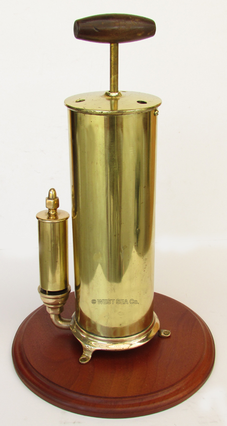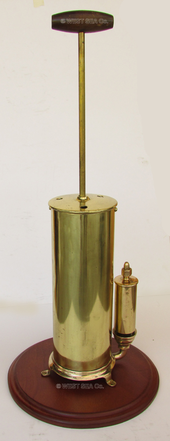 6.59 FOG WHISTLE. Absolutely charming late 19th century ship’s fog whistle of American manufacture. This solid all brass device was used by crewmen on the ship’s foc’sle to alert nearby ships in heavy fog. It consists of a cylindrical brass body containing a hand ‘tire pump-like” plunger with wooden handle. When pushed by hand it blows air into its side-mounted classic steamship whistle with handsome acorn finial. The result is a resounding, loud toot which can be heard from a long distance! It is mounted to a very handsome custom-made African mahogany base of exceptional quality. The whistle itself is 15 ¼ inches tall and 4 ½ inches in diameter. It is 5 ¾ inches wide at its bottom “feet.” Including the base it is 16 1/4 inches tall overall and 10 ¾ inches in diameter. Excellent original condition showing actual use in a high polished lacquered finish. A real charmer with a demonstrable feature in addition to its beauty, sure to delight listeners! 789 |