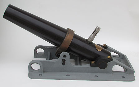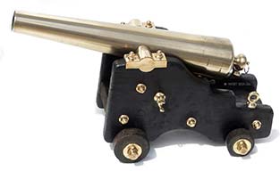 6.40 SALUTING CANNON. Highly desirable American yacht cannon from the second half of the 19th century. This extraordinary piece of American history was made by the Strong Manufacturing Company, New Haven, Connecticut circa 1880. It features a solid bronze barrel with a 1 1/16th inch “Number 4” bore, and a heavy pivoting breech block with percussion firing pin, spring-loaded closure, and shell extractor. The breech, with an outside diameter of 4 ¼ inches, will accommodate a 10 gauge shogun shell and is complete with its original and functional spring-loaded shell extractor. This unusually large version of yachting cannons measures 24 inches long on the barrel and 28 inches long overall. The ebonized hardwood carriage measures 17 ¼ inches long by 8 inches wide and 13 inches high overall. The total width at the wheels is 13 inches. Mounted within the carriage is the original rotating brass jack screw for precise elevation of the barrel by means of the 4-pronged lift screw. The top of the breech is faintly marked: