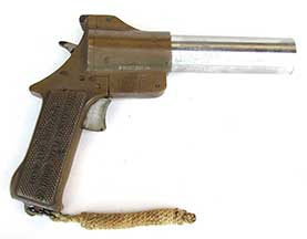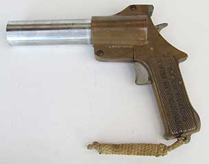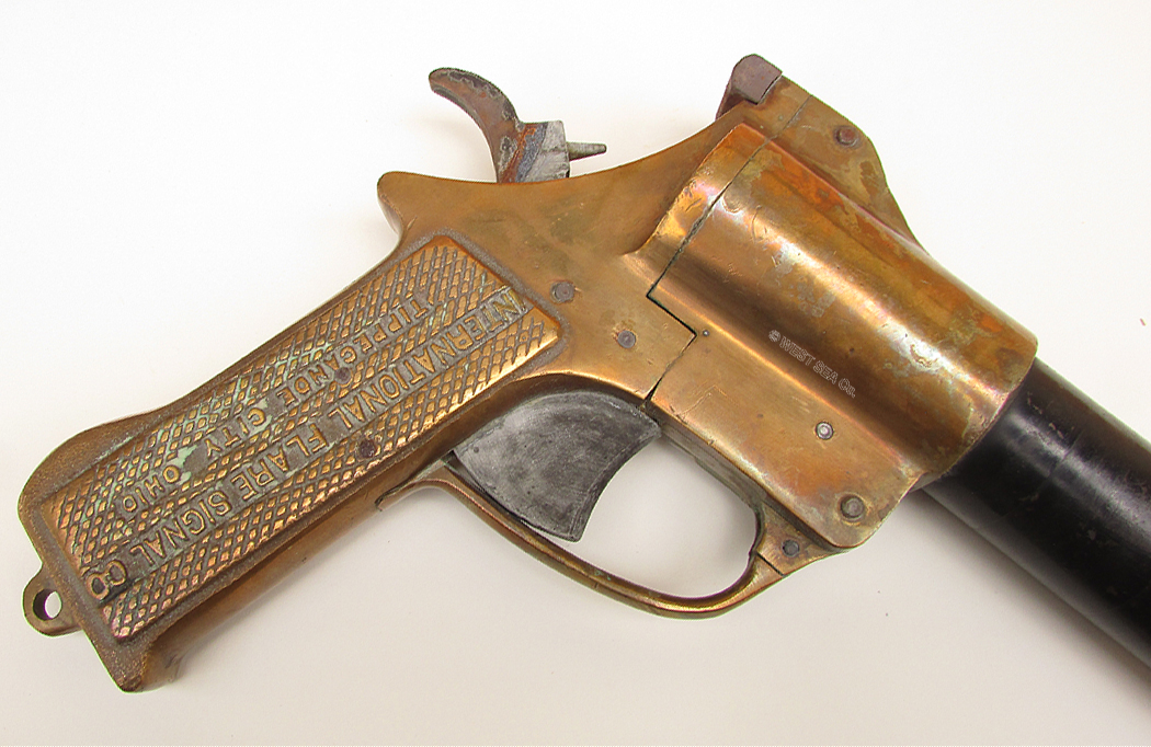 6.58 AMERICAN FLARE GUN. Impressive World War II era ship’s flare gun with a very heavy solid bronze chamber and grip. This authentic signaling device is embossed on the handle "INTERNATIONAL FLARE SIGNAL CO. TIPPECANOE CITY OHIO." The body is stamped "132230" then again “13230 PT.” and “FEB ‘43.” The handle is cross hatched to assure a firm grip. The large trigger activates the firing pin properly. There is a suspension loop on the butt for attachment to a lanyard if desired. The barrel tips forward to allow breech loading by means of a spring-loaded lever just forward of the hammer. The steel barrel has a bore of 1 3/8 inches. The action is tight and smooth. Approximately 11 ½ inches long by 8 ½ inches high. Excellent original condition. SOLD |