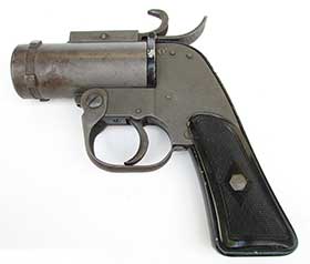 6.54 FLARE GUN. World War II vintage flare pistol adopted by the U.S Army and Navy in July 1942. This 37 mm gun is marked "EVCC U.S. PROPERTY PYROTECHNIC M-8, Serial No. E-173476." The butt of the grip is stamped with an ordnance cartouche and the inspector's mark "P." The gun is of hefty steel construction with hard rubber grips. The bore is 1 9/16 inches and the barrel is 4 1/8 inches long. The entire unit is 8 inches tall. The two levers allow pivoting of the barrel forward for loading and extracting the spent cartridge. Excellent original condition. Fully functional. 395 EVCC stands for the Eureka Vacuum Cleaner Company. Like so many large American manufacturers Eureka turned its production in support of the war effort in World War II. |