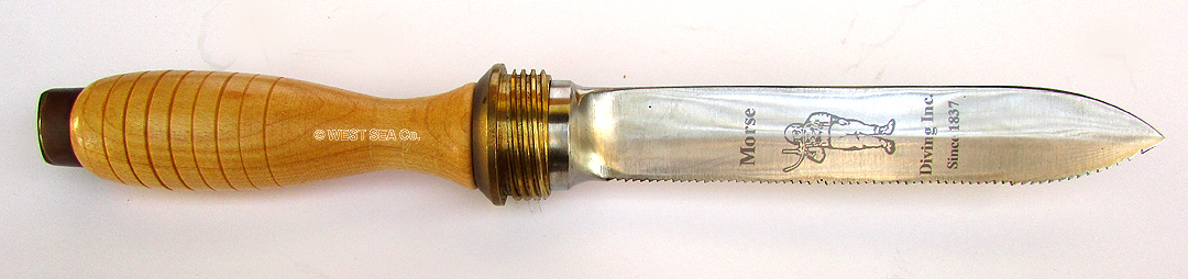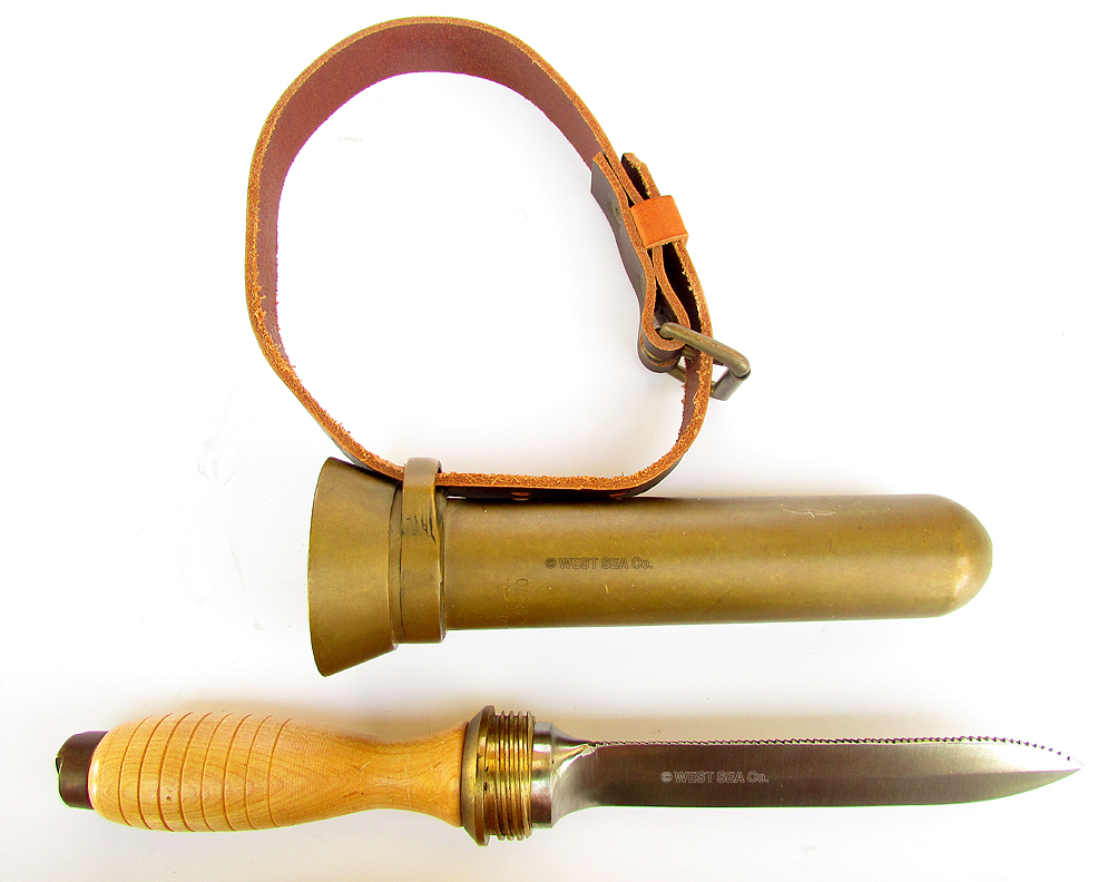 10.00 HARD HAT DIVER’s KNIFE. Authentic, highly sought after U.S. Navy Mark V hard hat diver’s knife made by the Morse Diving Equipment Company as stamped on the heavy bronze sheath, “MORSE DIVING EQUIP. CO. ROCKLAND, MA” This is a rare commemorative model produced by the company in 1987 in recognition of the company’s 150 years in business. The blade is etched with the figure of a hard hat diver and the inscription “Morse Diving Since 1837.” This handsome knife has a razor sharp steel blade on one edge and a serrated blade for sawing on the other. The turned hardwood handle is grooved for a positive grip and features a solid bronze butt and bolster. The bolster has a deep thread matching the solid bronze sheath, which allows the knife to be securely seated with only 1 ½ turns. The bottom of the sheath is equipped with a drain hole to release ambient water. The thick leather dive belt is present for attachment to the diver’s weight belt. The knife measures 12 ¾ inches long overall. The blade is 6 ¾ inches long. With the sheath, the overall dimension is 13 ½ inches long by 2 ½ inches thick. The leather belt loop is 2 feet long. Absolutely factory MINT condition! A rare collector’s item. 895