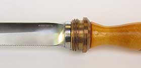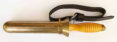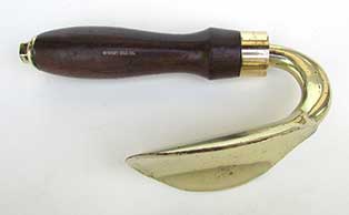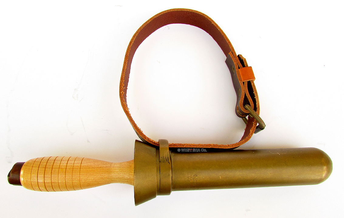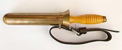 10.83 MARK V TOOL. Scarce, authentic World War II or earlier American-made tool used by a tender to assist a diver in donning his dress. This "cuff stretcher" was made by "Schrader U.S.A." as stamped in the handle. It consists of a handsome solid brass goose neck with flared spade, much like a shoe horn, designed to stretch the tight and bulky canvas/rubber sleeves of a hard hat diving suit. The wooden handle is lovely turned rosewood. 6 ½ inches long by 2 3/8 inches wide on the spade. Very heavy duty and in perfect condition! 195