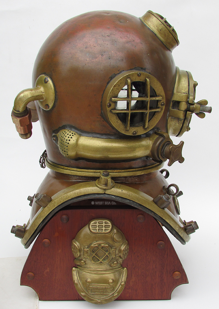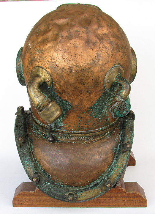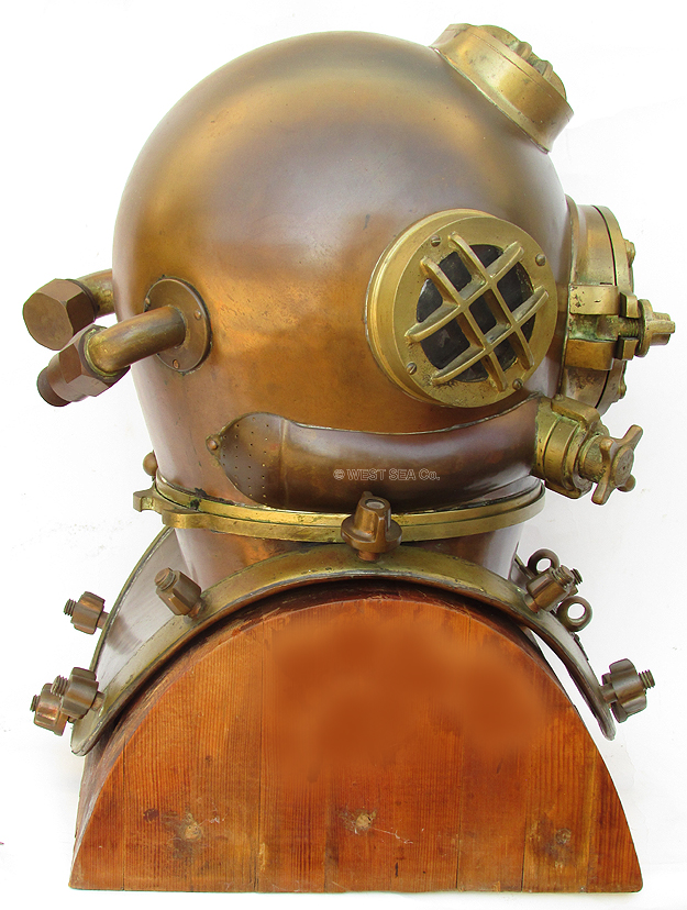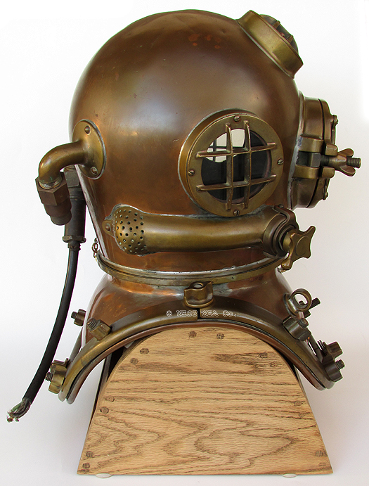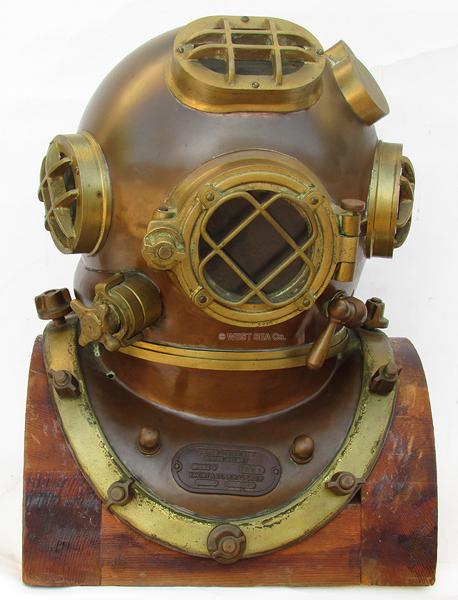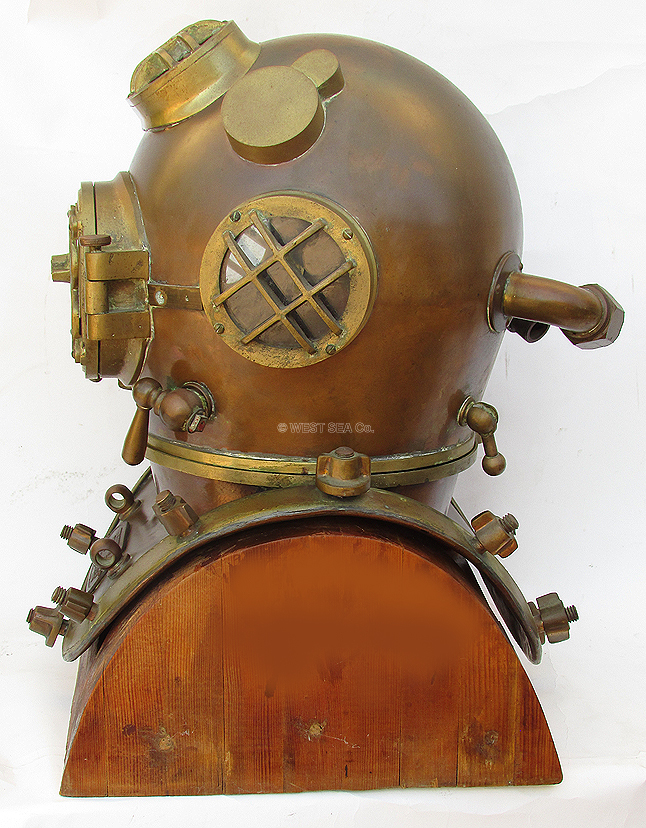 BROOKLYN, N.Y. U.S.A.This helmet is made of heavy spun copper with cast brass fittings and thick glass ports. Speaking to its actual wartime use in the United States Navy, the phone box bears the U.S. inspector’s marked of an anchor flanked by the letters “U S.” The interior is tinned and the bonnet has air channels leading from the air intake goose neck over the three ports. The phone communicator gooseneck contains its original components with cap and the original speaker marked “REPRODUCER” is in place. The chin button is present and functions properly. On the exterior, all fittings are original and in tact. Each of the four brales is marked “FRONT” and “BACK” respectively. The rear dumbbell lock with cotter pin and chain is present and functional. Also present is the non-return valve on the air inlet gooseneck. Not only is it marked “SCHRADER” it also bears the Navy inspector’s mark! The entire unit, weighing 55 pounds, is in excellent condition. There are of course the expected minor dents and dings in the top of the bonnet from actual diving! Complete with a fabulous custom-made wooden stand which has heavy brass Mark V plaques cast from the originals of the diving locker on board a submarine rescue ship (ASR) when deployed in Italy. SOLD