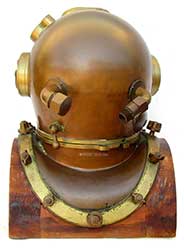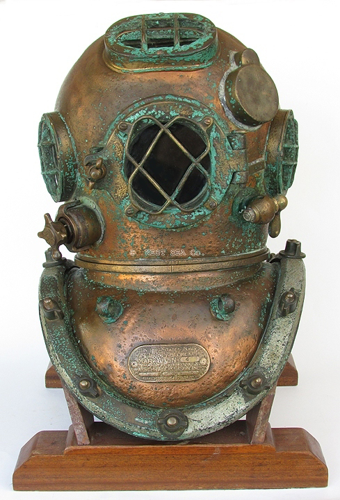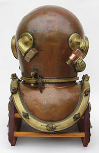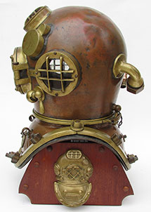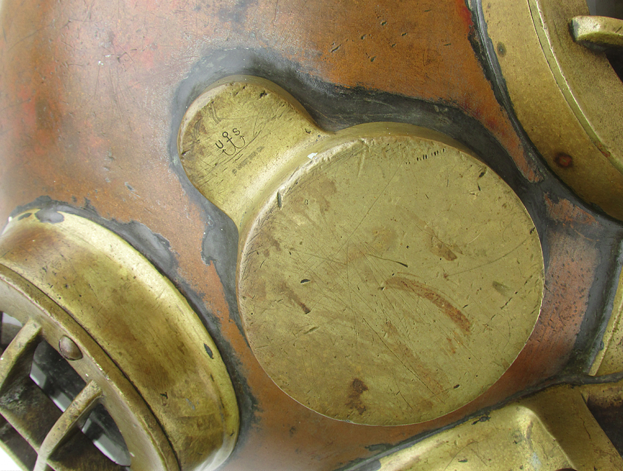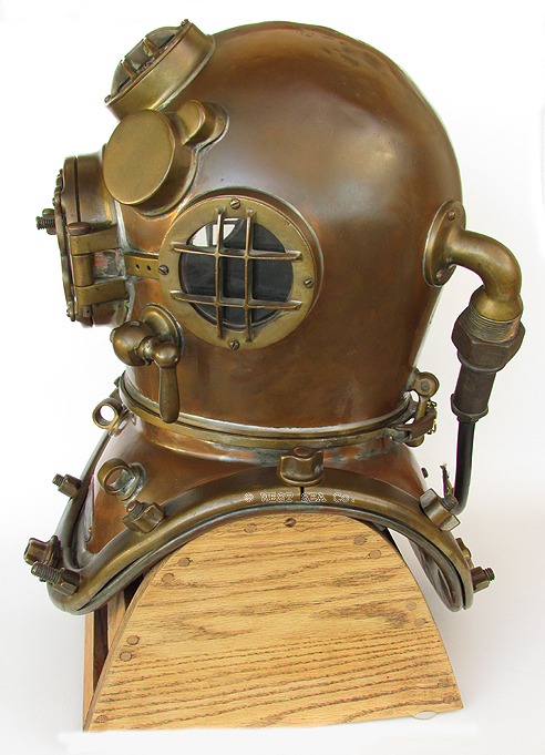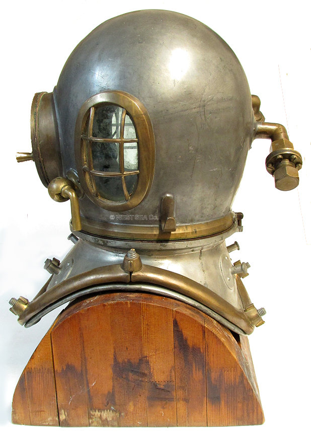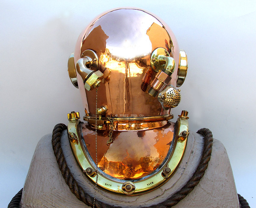 BROOKLYN, N.Y. U.S.A.This helmet is made of heavy spun copper with cast brass fittings and thick glass ports. Speaking to its actual wartime use in the United States Navy, the phone box bears the U.S. inspector’s marked of an anchor flanked by the letters “U S.” The interior is tinned and the bonnet has air channels leading from the air intake goose neck over the three ports. The phone communicator gooseneck contains its original components with cap and the original speaker marked “REPRODUCER” is in place. The chin button is present and functions properly. On the exterior, all fittings are original and in tact. Each of the four brales is marked “FRONT” and “BACK” respectively. The rear dumbbell lock with cotter pin and chain is present and functional. Also present is the non-return valve on the air inlet gooseneck. Not only is it marked “SCHRADER” it also bears the Navy inspector’s mark! The entire unit, weighing 55 pounds, is in excellent condition. There are of course the expected minor dents and dings in the top of the bonnet from actual diving! Complete with a fabulous custom-made wooden stand which has heavy brass Mark V plaques cast from the originals of the diving locker on board a submarine rescue ship (ASR) when deployed in Italy. SOLD
