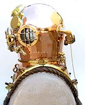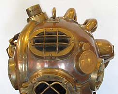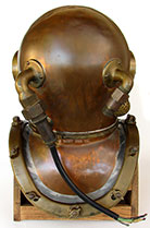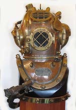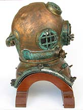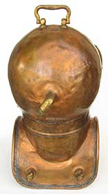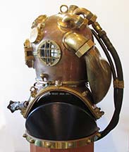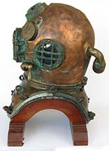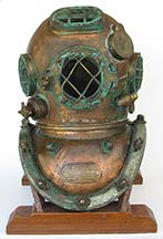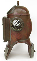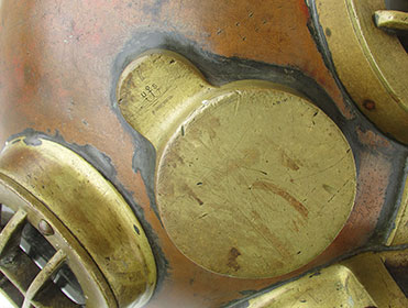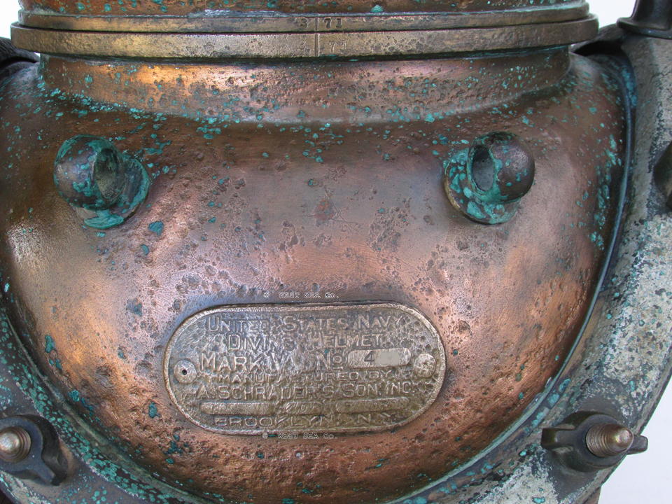 10.35 MARK V DIVING HELMET. Here is an original, highly sought after, and by far most collected hard hat diving helmet ever -- an authentic World War II era U.S. Navy Mark V. This is an early example manufactured by A. Schrader’s Son of New York, the firm which went out of business at war’s end. The front breastplate of this unique looking helmet bears the bears the embossed cast brass oval breastplate maker's tag reading: UNITED STATES NAVY This helmet is made of heavy spun copper with cast brass fittings and thick glass ports. The interior is tinned and the bonnet has air channels leading from the air intake goose neck over the three ports. The phone communicator gooseneck contains its original components with cap and the transducer is present. The chin button and spit cock are in place and function properly. The exhaust valve is impressed with the “BTE” logo indicating its desirable manufacture by the "Batteryless Manufacturing Company” which produced such components in the 30’s and early 40’s. On the exterior, all fittings are original and in tact. The neck ring serial numbers of the bonnet and breastplate match, coinciding with the numbers stamped on the underside of each brale. The front two brales bear markings "FRONT" and the rear two brales are marked "BACK" and on the underside each bears the same bonnet and breastplate number. The entire unit, weighing 55 pounds, is in totally original condition! This old veteran of the sea was obviously well used. It has several small dents in the bonnet. The entire surface bears small pock marks from exposure to salt water, and portions of the helmet are covered with a heavy bluish green verdigris. All of this combines to make this hard hat provide a very unusual and extremely appealing old look. * For the personal privacy of the ultimate buyer, the serial number of this helmet is being withheld. |