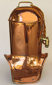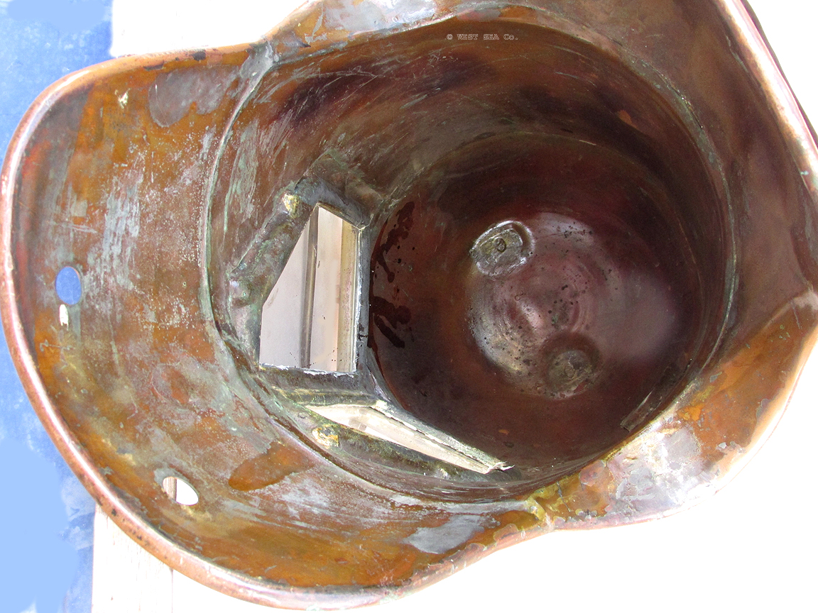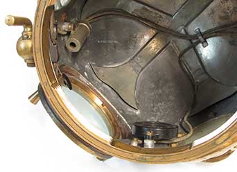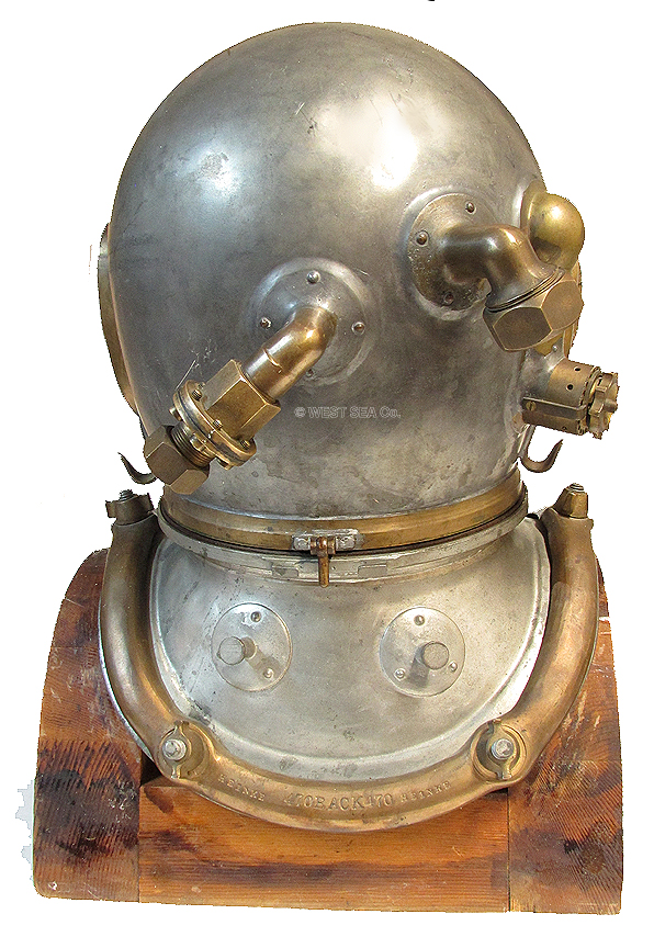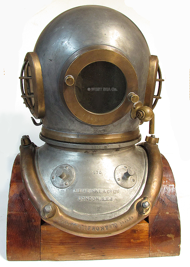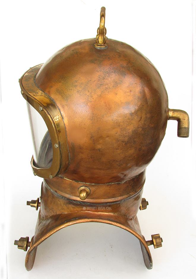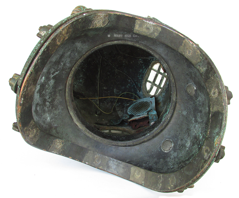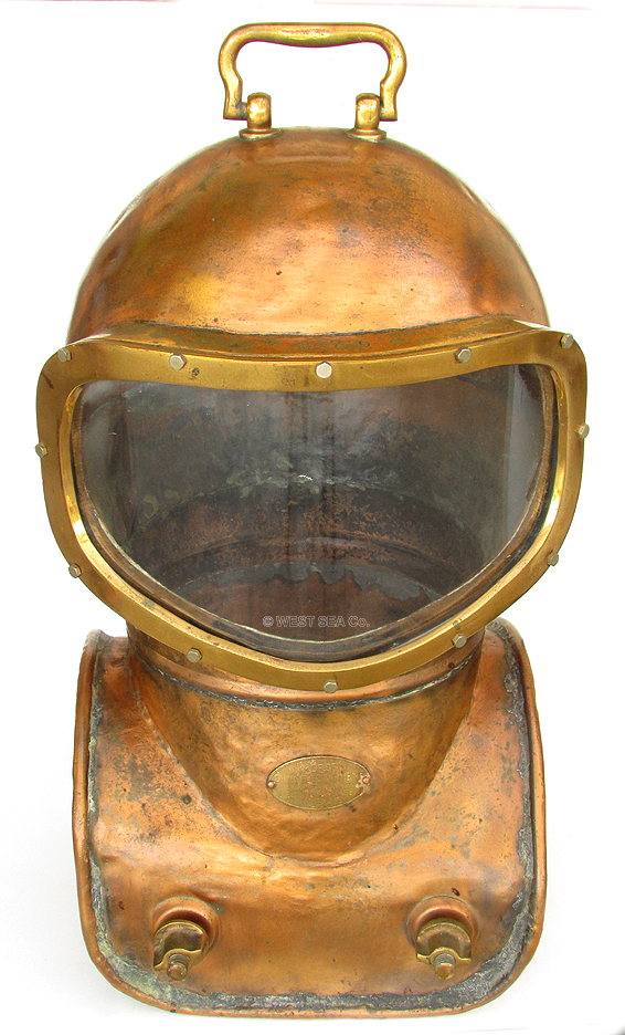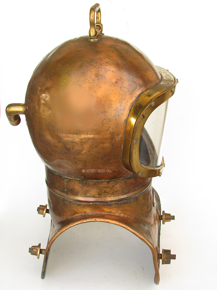 10.98 DIVING HELMET. Genuine early World War II era deep sea diving helmet of English manufacture. This 6 bolt, 3 light hard hat diving helmet is all copper with brass fittings and original tinned finish. The breastplate is boldly embossed “C.E. HEINKE & Co LTD LONDON. S.E. 1” and is stamped with the serial number “470.” The bonnet has a threaded faceplate stamped “116456.” The two oval sidelights have heavy brass grills protecting their thick glass ports. The left front (diver’s) is equipped with a functional spit cock valve. The rear of the helmet has 4 fittings. On the neck ring is a pivoting bar which securely locks the bonnet into a corresponding slot on the breastplate. Directly to the rear is the air inlet goose neck with its operational non-return valve and cap nut. The telephone goose neck next to it has a large hexagonal cap nut marked “TELEPHONE.” Forward of it on the diver’s right is the air exhaust with 9-pointed star valve. Both sides of the helmet have a substantial hook for attaching lines or suspending weights. Inside the bonnet are 3 air ducts which channel venting air over the ports. A Bakelite speaker is on the diver’s right for communicating with the surface. A chin button on his left operates his microphone. Indicative of its age the helmet contains its old original cloth-insulated wiring. Both the face plate and the neck ring retain their original leather O-rings. The breastplate has both original brales marked “HEINKE” and “FRONT” and “BACK” respectively. All 6 original lug nuts are present. There are 4 riveted posts on the breast plate: two front and back, for further attachments. The helmet measures 13 inches wide by 19 ½ inches tall and is 17 inches front to back inclusive of the goosenecks. It weighs 47 pounds. Outstanding original condition throughout. We have been handling diving helmets for over 45 years. Without a doubt, this pristine example is the best we have had the pleasure of offering. SOLD