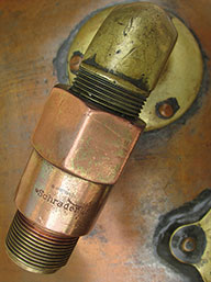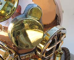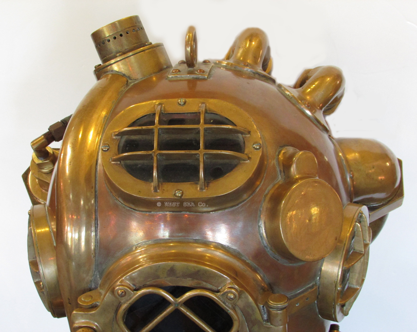 1. Center and left helmets have been chemically darkened, including all exterior fittings. The copper "bonnets" (shells) of original Mark V's were coated with tin, but ususally the fittings were not tinned.