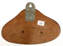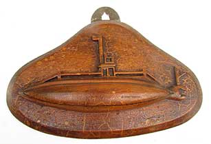 10.39 ANTIQUE SUBMARINE MODEL. Truly extraordinary, late 1800’s sailor-made representation of one of the world’s first submarines! This period, one-of-a-kind model was entirely hand-crafted of mahogany depicting the distinctive “cigar-shaped” craft with life rails, conning tower, periscope and propeller. The sternpost flies a pennant indicating Naval service. The vessel is mounted on a triangular backboard with large tin hanging bracket on the back. All surfaces are heavily variegated showing great age. The vessel itself measures 8 ¼ inches long and 4 inches tall. Our research indicates this submarine is possibly the “NAUTILUS” by Ash & Campbell 1886, or the “PORPOISE” by James Franklin Waddington 1886, both of which were very early British innovations. To further substantiate its English attribution, this item was sold in London in 2004 by the prestigious Christie’s Auction House. An original auction sticker attesting to that fact is attached to the back. Overall dimensions of the presentation are 10 ½ by 7 ¾ inches. Outstanding, untouched original condition. For the collector of submarine memorabilia this is certainly the ultimate. 1495