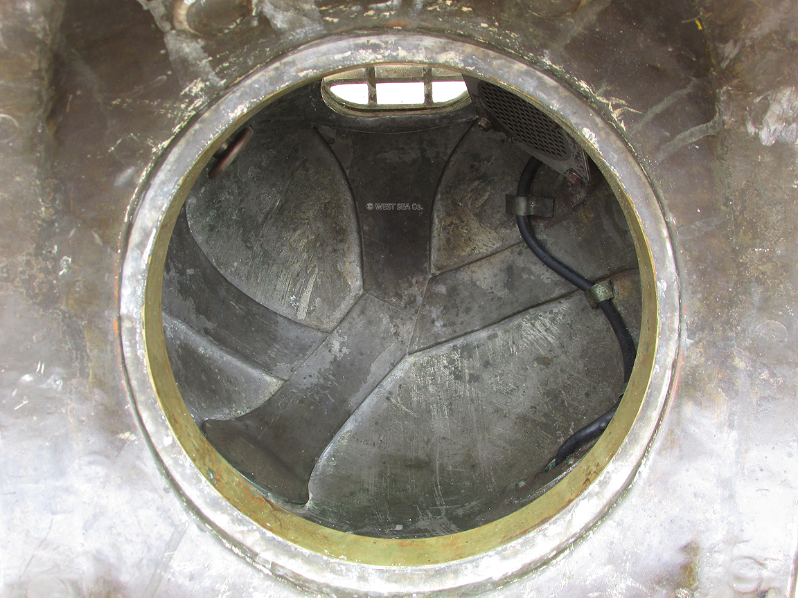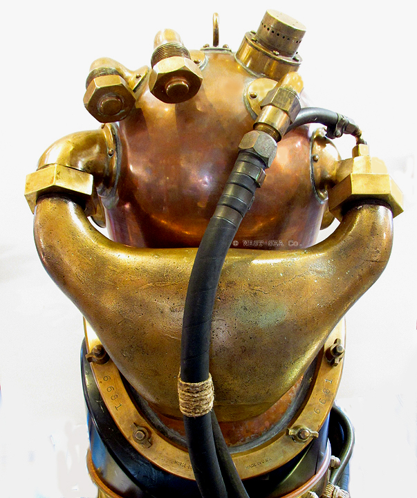 But there the similarities end. This helmet has no spitcock. The dumb bell lock between the bonnet and breastplate is forward on the diver’s left. The neck ring numbers, tag number, and all brale numbers match. There are a total of 4 goosenecks leading into the bonnet. Two huge connections attach the massive brass mixing canister at the rear of the helmet. Mounted to the goose neck on the diver’s right is the helium inlet which connects to the airline whip. The whip leads to the chest valve mounted to the front of the breastplate. This combination Helium/Oxygen line, known as the “Heli-OX” is very rare in its own right. Two more goose necks house the telephone communication system leading to the transducer which would have been mounted within the phone box receptacle. A fifth fitting is the bubble diffuser extending up the right side (diver’s) of the helmet from the exhaust valve. The crowning touch, quite literally is the heavy brass eyelet on the top of the bonnet. This was used in conjunction with a crane to lower and retrieve the heavily burdened diver in the water! The entire assembly measures 28 inches tall by 19 inches wide by 22 inches deep and weighs close to 100 pounds! Overall condition is excellent with signs of obvious use but no abuse. Traces of the original tinning exist on all surfaces. The remainder bear a nice patinated copper appearance. The interior air vents are all in place and the entire interior is tinned. The chin button, exhaust valve and chest valve all function properly. This is a once-in-a-lifetime opportunity to acquire such an impressive representative of cutting edge American diving history!