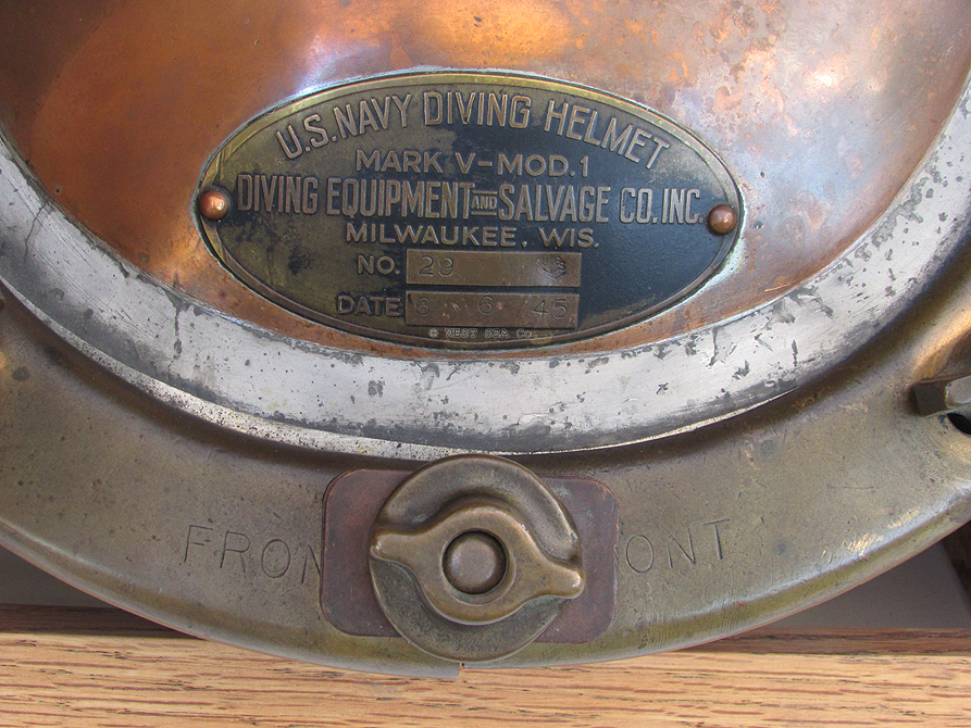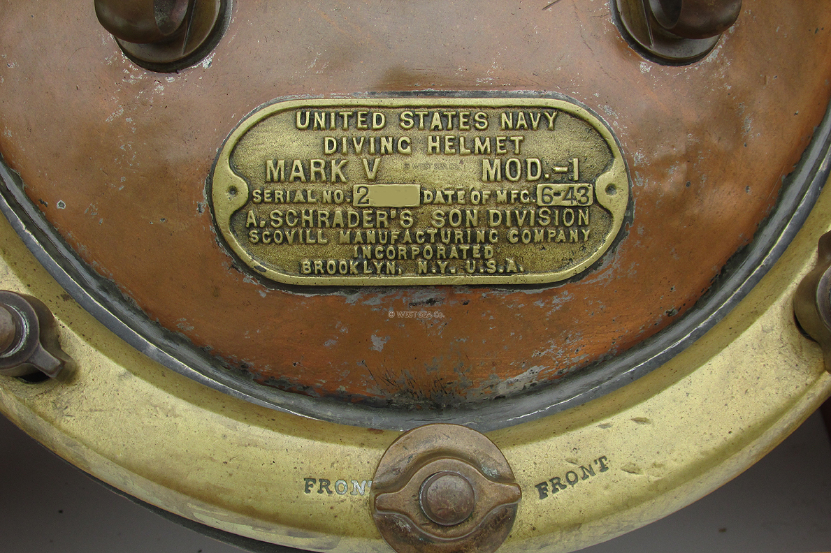 10.36 MARK V DIVING HELMET. This is it! The most sought after hard hat diving helmet ever made -- the U.S. Navy Mark V. Here is an especially nice original example with a thick cast brass maker’s tag affixed to the front of the breastplate. It reads: