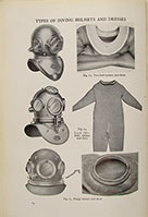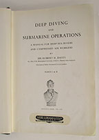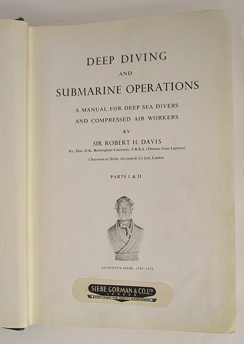 10.05 IMPORTANT DIVING REFERENCE BOOK. Sir Robert H. Davis, “Deep Diving and Submarine Operations, Part I & II,” Sixth Edition 1955, Siebe Gorman & Co., Great Britain. Hard cover, 695 pages exclusive of index and fold-out map. Certainly the “bible” of early diving technology and innovation. In the first half of the 1900’s Mr. Davis was the chairman of the famous pioneer diving equipment manufacturing company established by its founder Augustus Siebe in 1819. This 6th edition is the embodiment of knowledge garnered from the earliest deep sea operations well into the experiences of World War II. Contained in 20 chapters and 7 Appendices, it is a thorough treatment of the subject. Some of the topics covered are: Physics and physiology, Dressing the diver, Helium and oxygen in deep diving, Diving bells, Armoured diving apparatus, Underwater tools, Escape form sunken submarines, Underwater warfare, Diving for treasure, Salvage of sunken ships, Divers’ yarns and adventures, and a most fascinating Illustrated history of Diving. The Appendices include topics on Maximum depths, Submarine escape, Underwater television, and the Greatest ocean descent, among others. The cloth cover is lifted on the front, no doubt from exposure to the marine environment in which it was actually used. However the hard cover itself is sound and intact. Importantly the entire content is in very fine, very presentable condition. 195