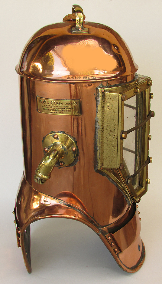 The now legendary Miller-Dunn Company of Miami is shrouded in a good deal of mystery, even though it is documented that the company produced hard hat diving helmets over the course of more than 30 years. Begun in 1915 as a partnership between a plumber and machinist the company was best known for its shallow water "Divinhood" designs which were patented in the United States and abroad. In his monumental reference book "Helmets of the Deep" by Leon Lyons, 1988, Leon Lyons, Hollywood, Florida, Mr. Lyons writes on page 133, "The number two and 3 styles are most popular among collectors of nautical antiques. They have such a strange look about them.”