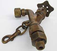 10.77 HARD HAT DIVING CHEST VALVE. Genuine, heavy duty World War II vintage, solid bronze air inlet valve used by hard hat divers to regulate the amount of incoming air they received. Such apparatus was crucial to stabilize both the diver's breathing and his buoyancy. This heavy, precision-cast bronze relic consists of a 5-pointed handle leading to a gooseneck which connects to the surface airline hose. The opposite end was connected by a short length of hose to the helmet inlet air gooseneck itself. The original all brass clip for attachment to the helmet is still present. 7 3/4 inches long by 6 ¼ inches high and 2 ¾ inches thick at the widest. Perfect original condition exhibiting a wonderful statuary bronze patina surface. This component is an essential key element when exhibiting a full dress diving helmet known as a "Jake."