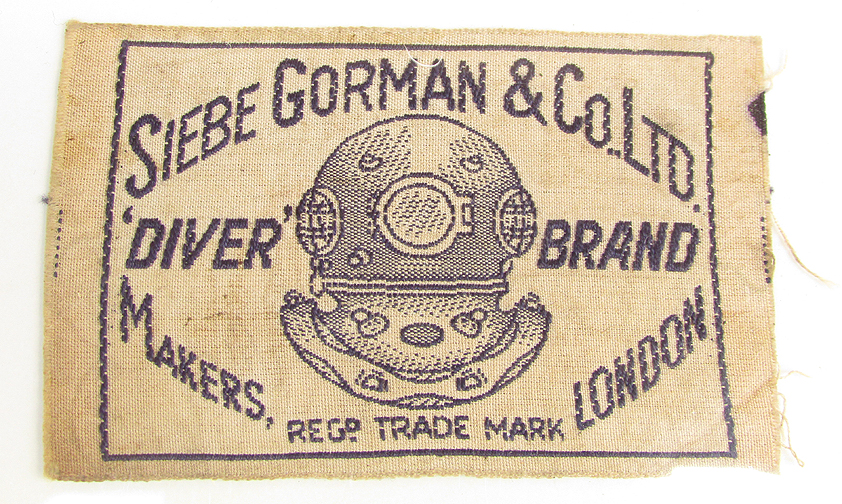 10.88 HARD HAT DIVER's PATCH. Extremely rare, early 1900's cloth label bearing the trademark of the first and most famous deep sea diving helmet makers "SIEBE GORMAN & CO, LTD." This cotton cloth patch depicts a 6 bolt helmet flanked by the words 'DIVER BRAND.' It measures 2 by 2 ¾ inches and is in excellent condition. A super scarce, beautifully preserved relic from the early days of hard hat diving. 95