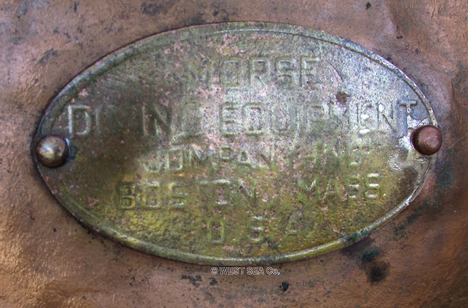 10.19 MARK V DIVING HELMET. This is it! The ultimate! Offered here is an original, very sought after, and by far most collected hard hat diving helmet ever -- an authentic World War II era U.S. Navy Mark V. Even more special, this is an early example manufactured by the venerable Morse Diving Equipment Company of Boston, bearing much of its original tin finish! The front of this handsome helmet bears the embossed cast brass oval breastplate maker's tag reading: UNITED STATES NAVY DIVING HELMET This helmet is made of heavy spun copper with cast brass fittings and thick glass ports. The interior is tinned and the bonnet has air channels leading from the air intake goose neck over the three ports. The phone communicator gooseneck contains its original components with cap and the fittings for holding the transducer are present. The chin button and spit cock are in place and function properly. On the exterior, all fittings are original and in tact. The neck ring serial numbers of the bonnet and breastplate match, coinciding with the number stamped on the left rear brale. The front two brales bear markings "FRONT" and the rear two brales are marked "MORSE BOSTON / MADE IN U.S.A." respectively. The entire unit, weighing 55 pounds, is in excellent totally original condition! There are of course the expected minor dents, dings and mild surface corrosion expected of a working helmet! In 1837 the partnership of Fletcher and Morse was formed to manufacturer brass goods at the corner of Water and Congress Street in Boston. When Mr. Fletcher retired in 1864, the firm name changed to Andrew J. Morse & Son as makers of "submarine diving apparatus." In 1881 Andrew Morse died and his son, William F. Morse, continued the business under the same name. In 1905 when William retired, ownership of the business was transferred to William's daughter, Elizabeth, and the firm name was changed to Andrew J. Morse & Son, Inc. In 1940 the company name changed yet again to Morse Diving Equipment Co., Inc. of Boston. In 1970, rights to the company were purchased privately and the new firm was moved to Rockland, Massachusetts. In 1998 the company was sold once more with the resultant name of Morse Diving, Inc. at 199 Weymouth Street in Rockland. Morse was best known for its development of the Mark 5 helmet system for the United States Navy in 1914. Ultimately, 3 other companies: A. Shrader's Son, Diving Equipment & Salvage Company (later "DESCO") and finally Miller-Dunn, also produced Mark V helmets for the Navy throughout World War II. But Morse was the originator. * For the privacy and security of the ultimate purchaser, the serial number of this helmet is being withheld. |