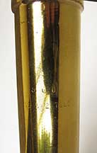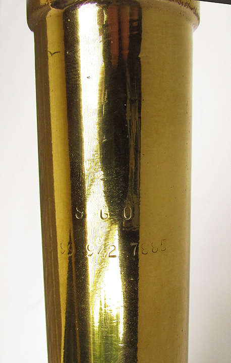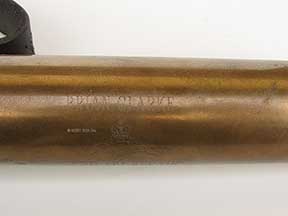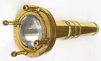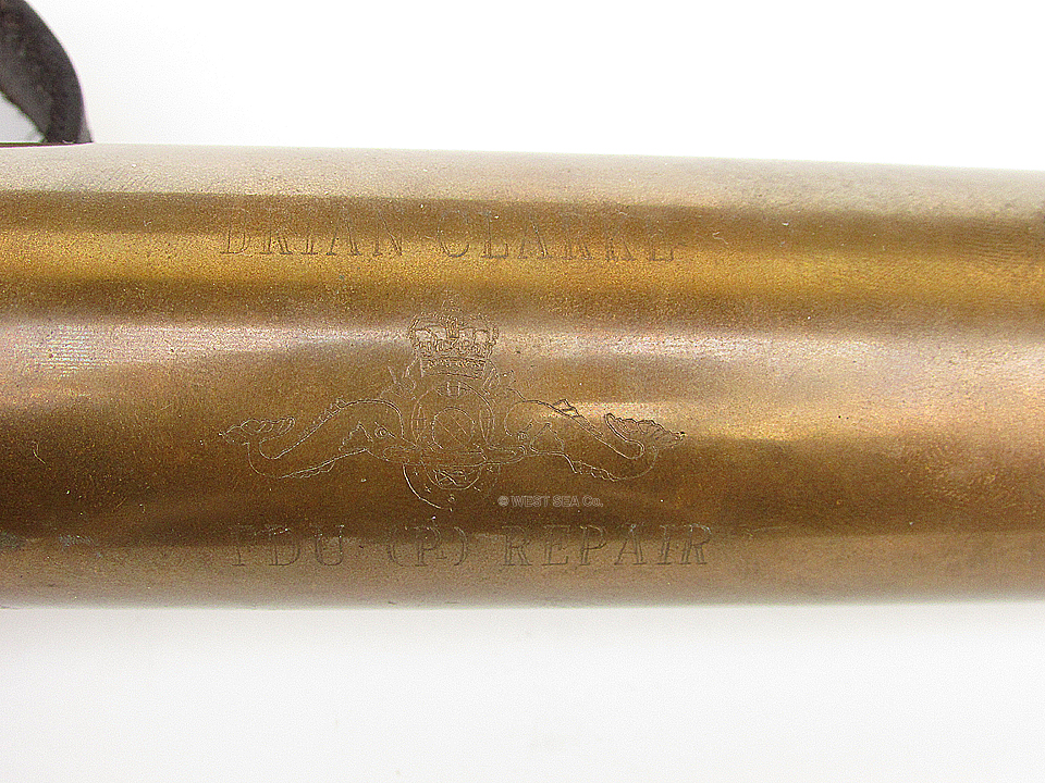 10.96 DIVER’s LAMP. Authentic World War II deep sea diver’s hand light known as a “diver’s torch.” This scarce all brass example of hard hat diving equipment was made by the famous Siebe Gorman Co., London in 1942, as indicated by stampings on the side “S G O 942.” The heavy body has knurled grips with the working end terminating in a bulbous convex glass bulls eye lens encircled by 4 protective prongs. These were a distinctive feature, unique to the company’s production. Inside is a silvered parabolic reflector surrounding the original incandescent light bulb. The filament of the bulb appears to be intact. The battery chamber is in good condition along with a bronze spring. This lamp is still in working order, when filled with 4 D-cell batteries. (Not included). 11 inches long overall by 3 ½ inches in diameter at the widest. The long tubular body is 1 5/8 inches in diameter. Excellent condition in a high polish with some areas evidencing expected spotting from actual use in the sea. SOLD
