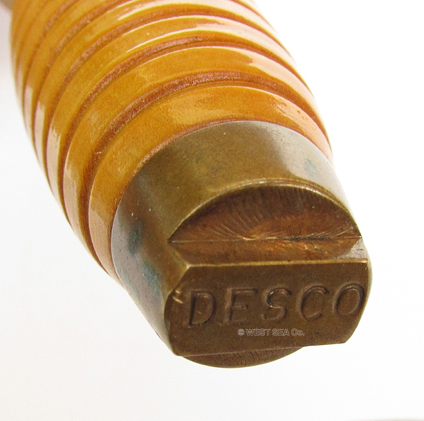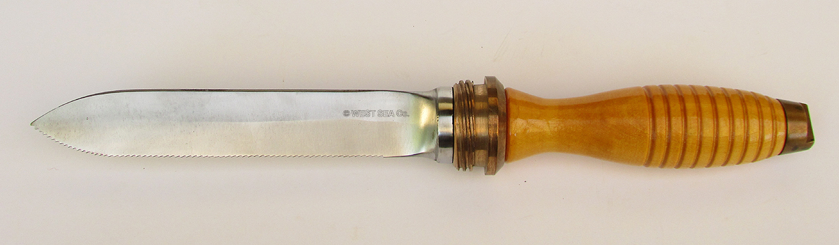 10.97 DIVER’s KNIFE WITH PROVENANCE. Rare, authentic Mark V hard hat diver’s knife made by the well known Milwaukie, Wisconsin diving manufacturer Diving Equipment Supply Company, “DESCO,” as impressed on the butt of the handle. What is very significant to the desirability and value of this knife is its history. The sheath is engraved “BRIAN CLARKE FDU (P) REPAIR” with the emblem of the Royal Canadian Diving Service consisting of a Mark V diving helmet flanked by two dolphins with the British Crown above. The knife is the standard Mark V form adopted in 1929. It consists of a stainless steel blade with a Maple wood handle and brass end cap. The solid bronze sheath has a drip hole at the bottom and is attached to a leather belt by means of a slotted clip just below the opening. The knife has broad Acme threads which require only 1 ½ turns to unscrew the knife from its sheath. The blade measures 7 inches long and the knife is 13 inches long overall. With the sheath it measures 13 ½ inches in length. The leather belt is 24 ½ inches long. Absolutely PERFECT, factory mint condition. SOLD