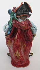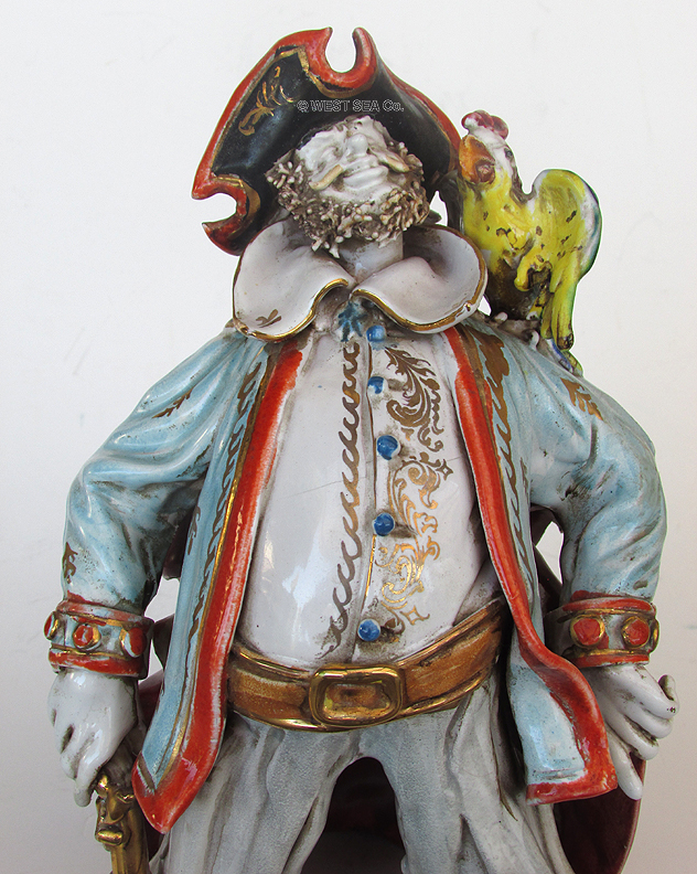 12.13 PIRATE BOOK ENDS. Matched pair of antique bookends in the form of swashbuckling pirates. This set is in its original antique bronze finish depicting the marauding pair in classic poses. Each carries a naval cutlass on his right resting in front of a treasure chest. Their left hands are poised on flintlock pistols tucked into their waist bands. The salty pair wear capes attached with a medallion on their chests. Their oversize seamen’s hats are embellished with a skull and crossed bones. The figures stand 7 inches tall, 4 inches side, 2 /34 inches deep and weigh a hefty 3 ½ pounds each. Perfect original condition showing good age. 295 Pirate memorabilia, especially from the actual era, is avidly sought after by collectors. |