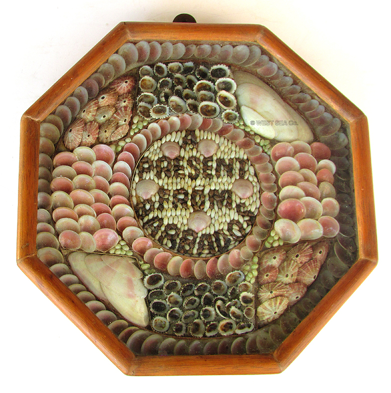 12.37 SAILOR’s VALENTINE. Early, very impressive, large double sailor’s shellwork valentine of the type produced in the Caribbean from the mid-1800’s onward. This example dates to the earliest production of these sailors’ mementoes as evidenced by the fact that it has a key lock -- a feature found only on the oldest, higher quality surviving examples. It is of classic diptych construction having two octagons hinged in the center. The cases are made of Spanish cedar having glazed covers of original old wavy glass protecting the fragile shells within. The geometric patterns so-formed are remarkably complex and extremely colorful. The left panel (also known as a “flat”) has a 6-side star with a central rosette. In keeping with the fact that this sailor memento was a souvenir for a loved one, the central theme of the right flat is a large heart encircled by 3 rosettes. Each flat measures 13 ¾ inches across with a combined overall width of 27 3/8 inches. Condition is absolutely outstanding, untouched, original. As bright and vibrant as it was made over 150 years ago! Museum-quality. |