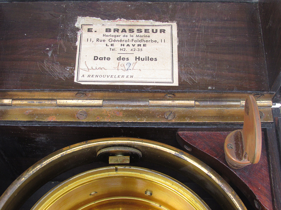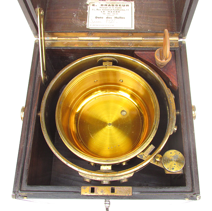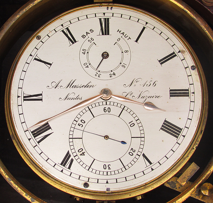 13.36 EARLY FRENCH CHRONOMETER. Offered here is a magnificent French ship’s chronometer well over 100 years old! Chronometers for French ships are scarce in today’s market, dominated by English and American examples. This precision timepiece has a perfect silvered brass dial beautifully hand-engraved “A. Masselin No. 156 Nantes, St. Nazaire.” It is boldly marked with Roman numerals and a minute chapter ring swept by SOLID GOLD spade hands! The subsidiary seconds bit below the center arbor is calibrated in single seconds marked by 10’s. The Up/Down winding indicator is below the XII. It runs from 0 to 56 hours and is marked “BAS/HAUT.” The 4 ½ inch dial is protected by its knurled brass bezel with a thick beveled glass crystal and silvered reflector ring. The chronometer is set in its original brass bowl with original lacquer finish. The bottom of the bowl has a rotating dust cover over the internal winding square. Unscrewing the bezel reveals the finest quality movement within. It has highly polished brass plates with contrasting blued steel screws. The heavy duty compensated bi-metallic balance with early style steel helical hairspring and diamond end stone has a spring detent escapement and of course a traditional chain-drive fusee. The bowl is slung in its stout gimbal ring with locking lever, all mounted in its very rich Coromandel wooden box with brass string inlays.* It has a lovely circular mother-of-pearl inlay in the upper tier. The box is complete with it folding inlaid brass handles on both sides and its original functional skeleton lock and key! It bears the old trade label of “E. BRASSEUR, Horologer de la Marine, Le Havre” dated 1927. The box measures 7 ¼ inches square and is 6 ¾ inches high. It is complete with its original brass ratcheted winding key. Overall condition is EXCELLENT in all respects. The chronometer is in good running condition, and keeps good time. Absolutely guaranteed to be as represented, or your money back. These days the gold hands alone must be worth close to this price! A genuine Best Buy! A $3900 VALUE NOW! 1495 |